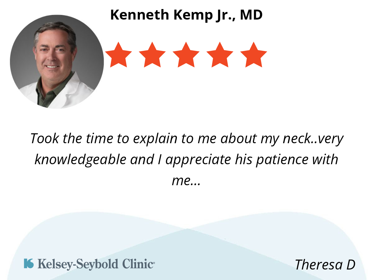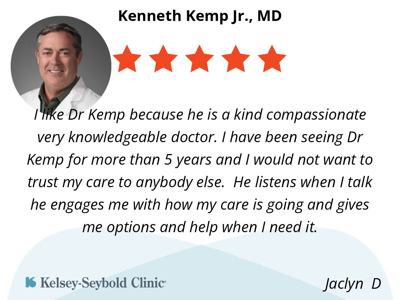 I like Dr Kemp because he is a kind compassionate very knowledgeable doctor. I have been seeing Dr Kemp for more than 5 years and I would not want to trust my care to anybody else. He listens when I talk he engages me with how my care is going and gives me options and help when I need it.
