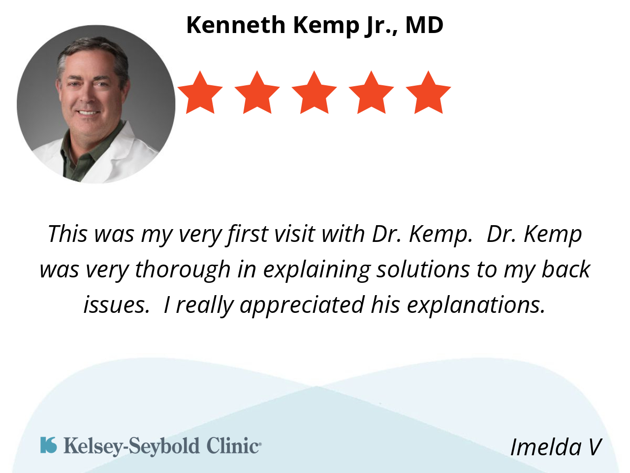 This was my very first visit with Dr. Kemp. Dr. Kemp was very thorough in explaining solutions to my back issues. I really appreciated his explanations.