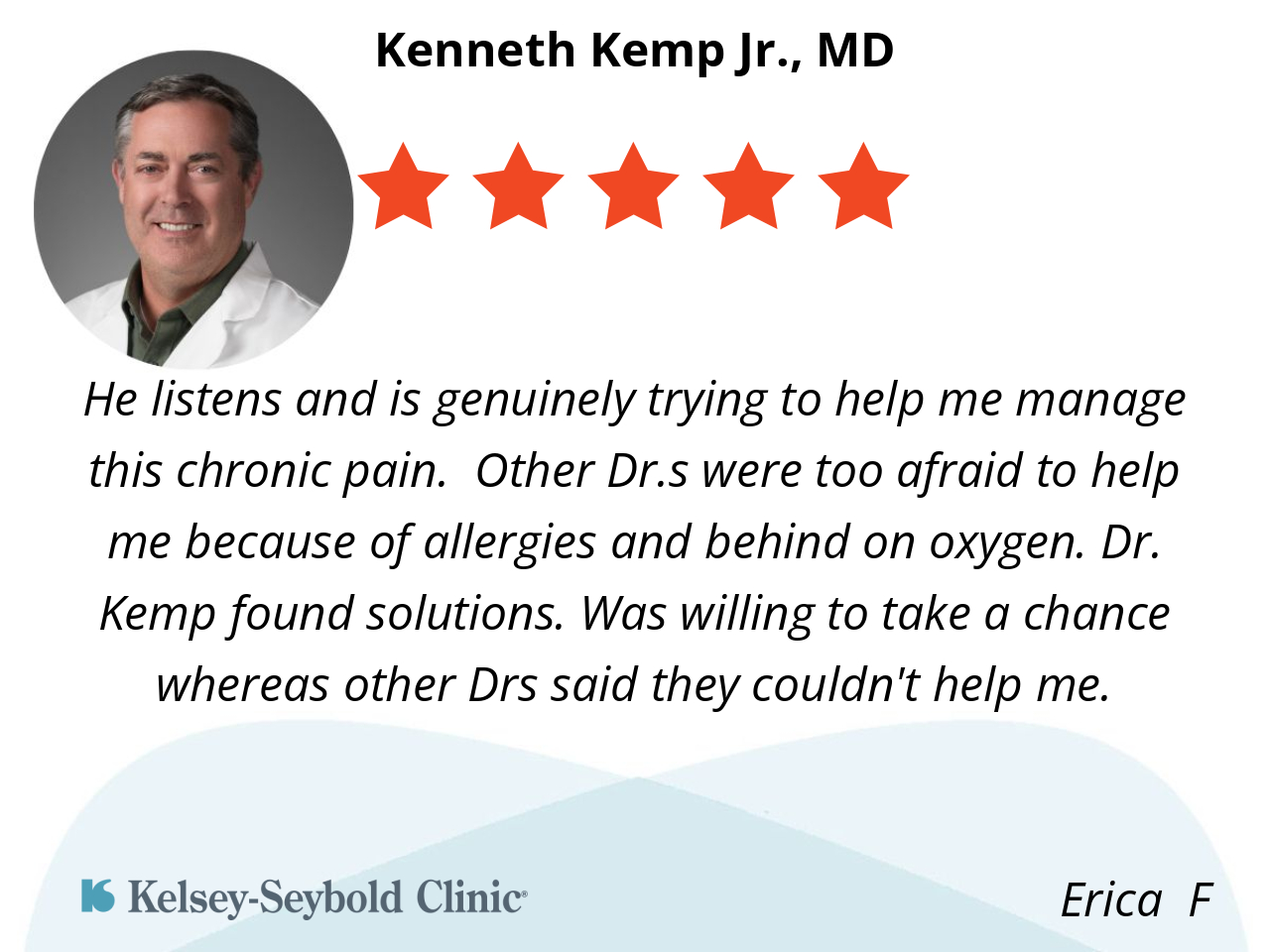 He listens and is genuinely trying to help me manage this chronic pain. Other Dr.s were too afraid to help me because of allergies and behind on oxygen. Dr. Kemp found solutions. Was willing to take a chance whereas other Drs said they couldn't help me.
