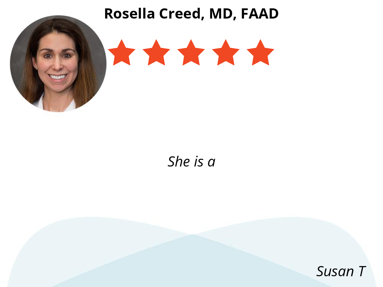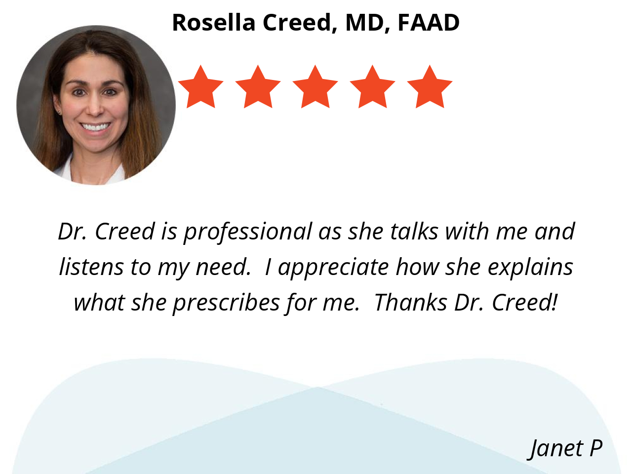 Dr Creed is very thorough, more thorough than any dermatologist that we have ever seen. She has a very pleasant personality and truly engages in conversation. She truly loves her job and takes pride in it and it shows! We drive over 90 minutes to see her because she is so good and would drive further if we had to.