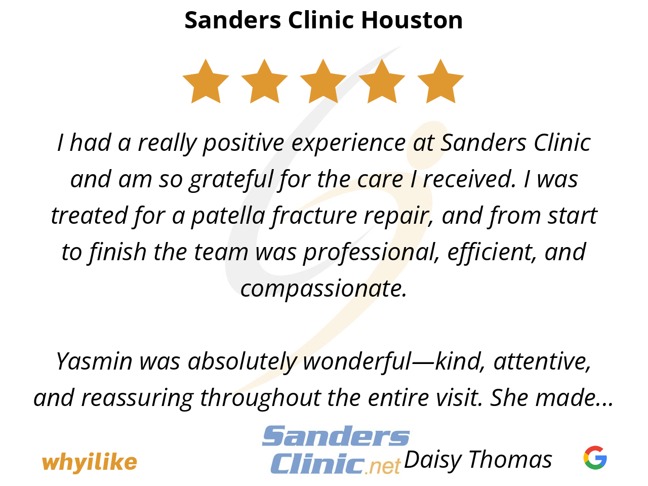 Also, Yasmin is an amazing assistant—super responsive and helpful with anything you need. If you’re looking for an orthopedic office in Houston that truly cares and gets results, I highly recommend Dr. Sanders and his team. Thank you again!