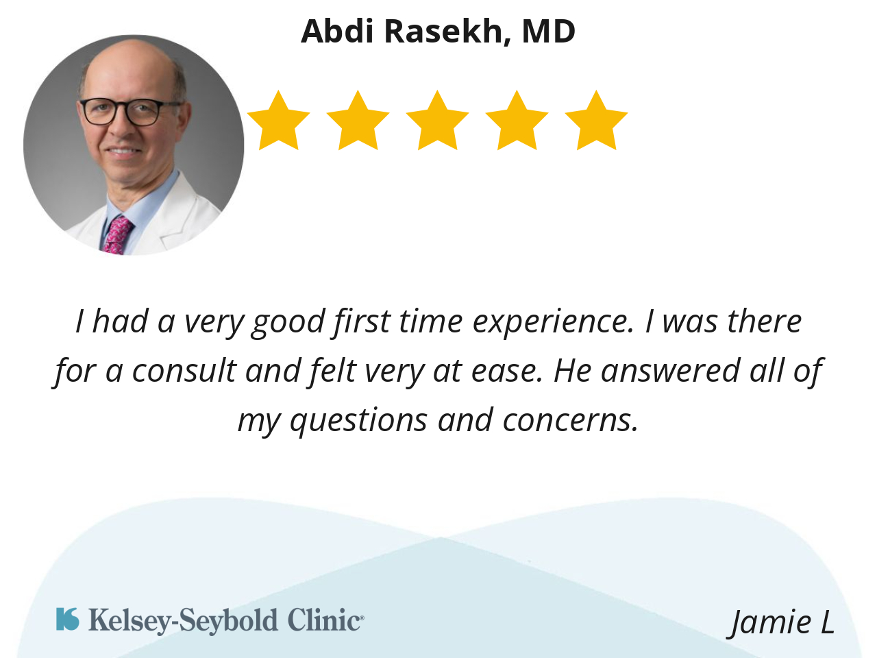 Dr. Rasekh is always willing to listen to my inane questions and give me good, professional advice. He's thorough in his diagnoses andforward thinking. I appreciate that.