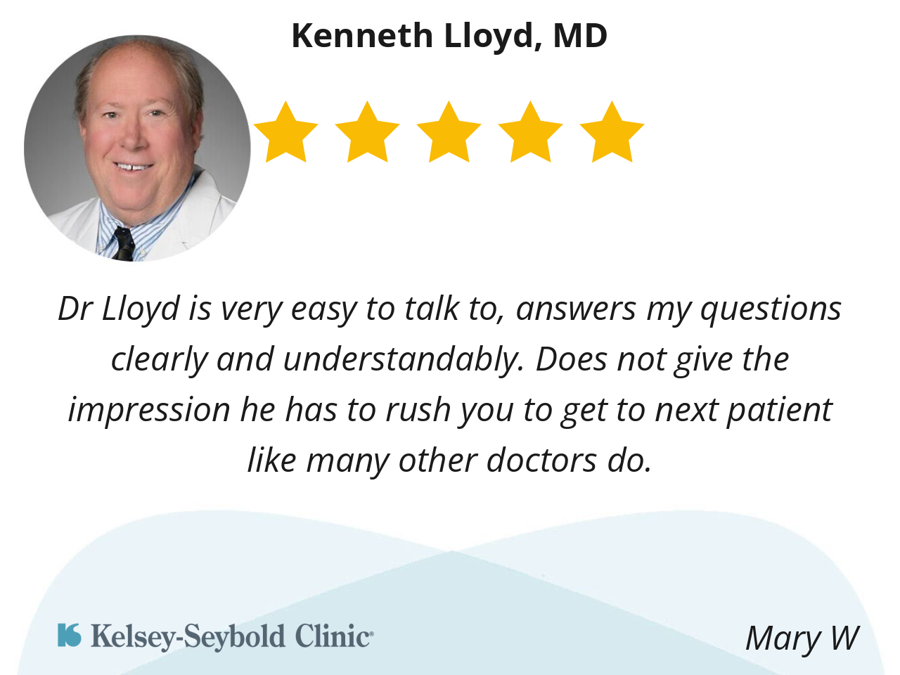 Dr. Lloyd is very friendly and personable. He was thorough and spent time talking with me. I felt heard, and was able to bring up many issues that had been bothering me. I have some really good doctors at Kelsey-Seybold that I like a lot. Dr. Lloyd is right at the top of my list.