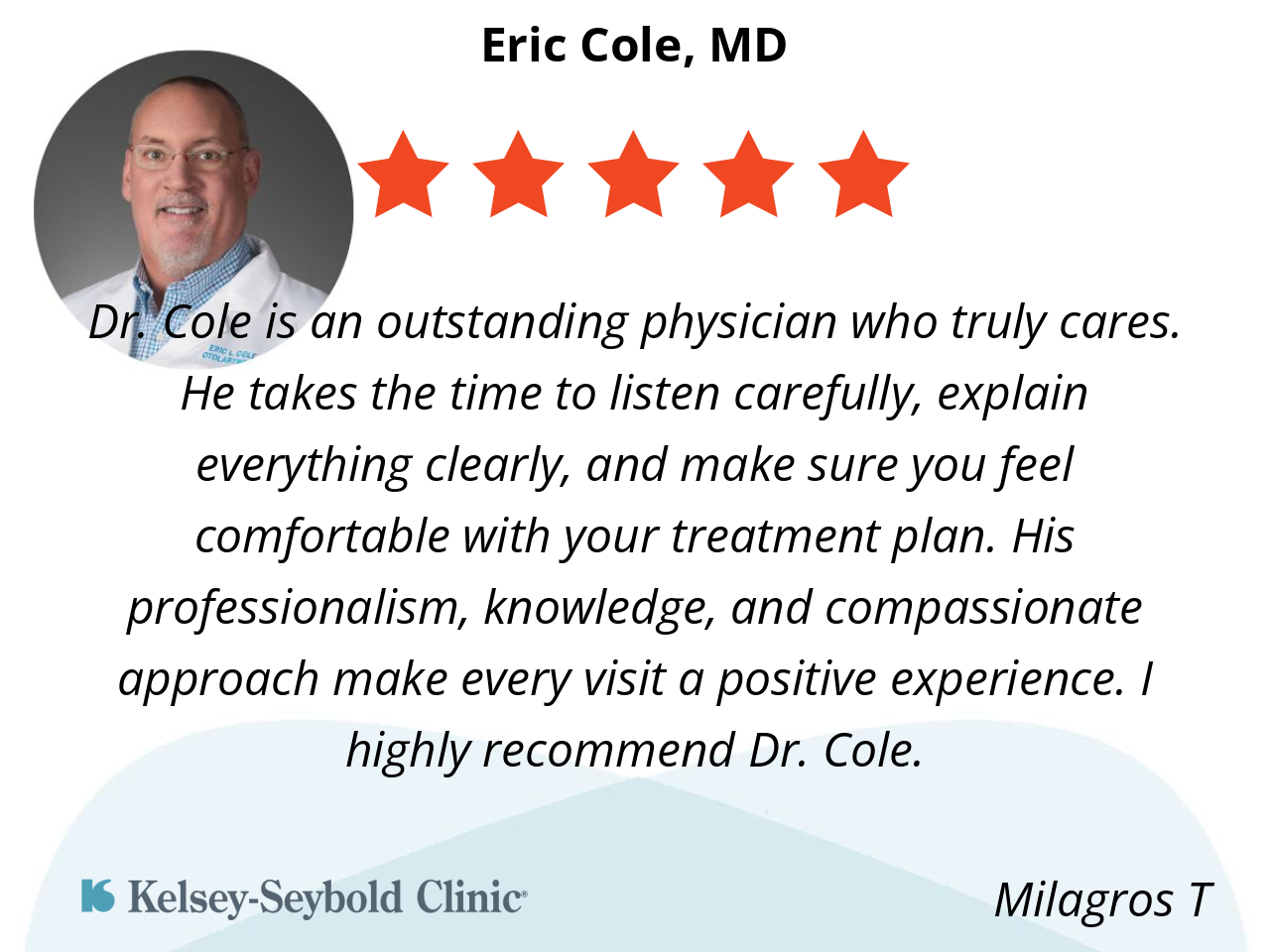 Dr. Cole is an outstanding physician who truly cares. He takes the time to listen carefully, explain everything clearly, and make sure you feel comfortable with your treatment plan. His professionalism, knowledge, and compassionate approach make every visit a positive experience. I highly recommend Dr. Cole.
