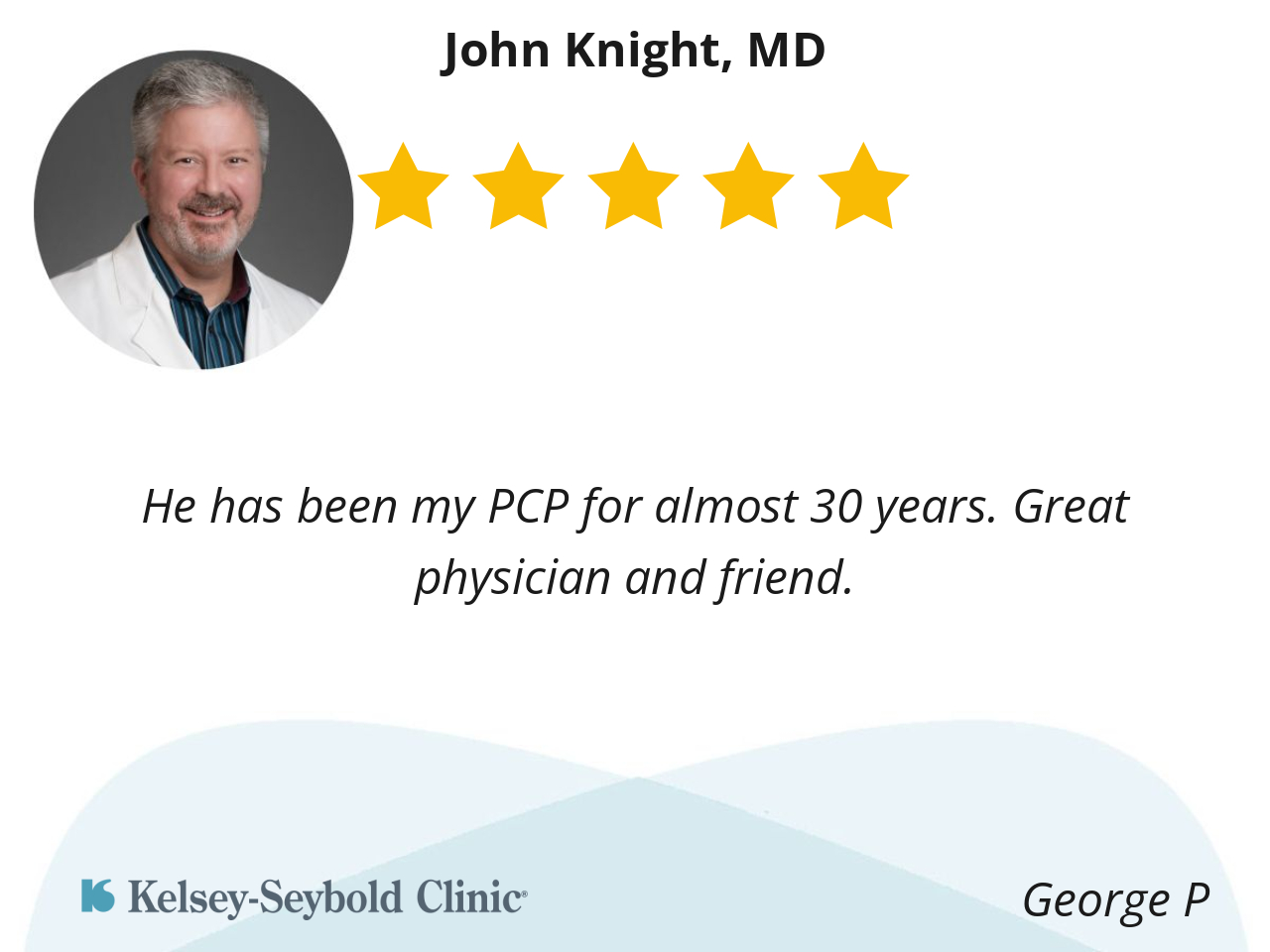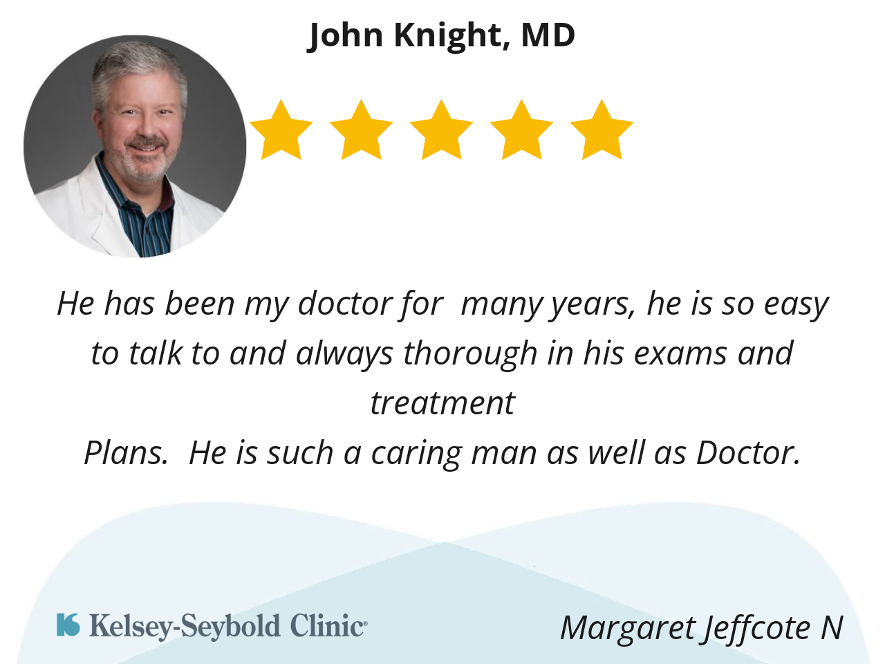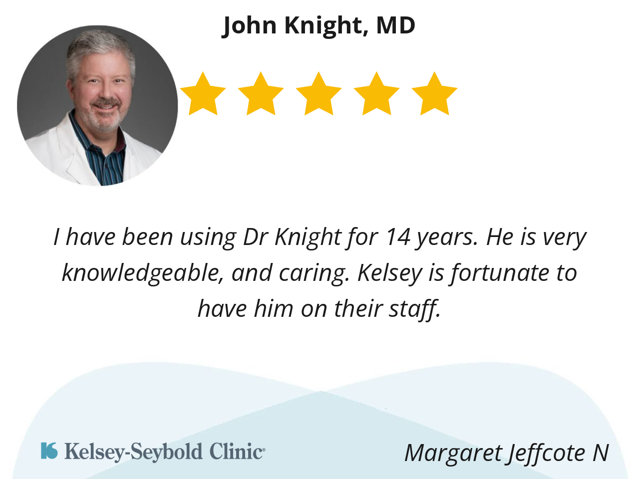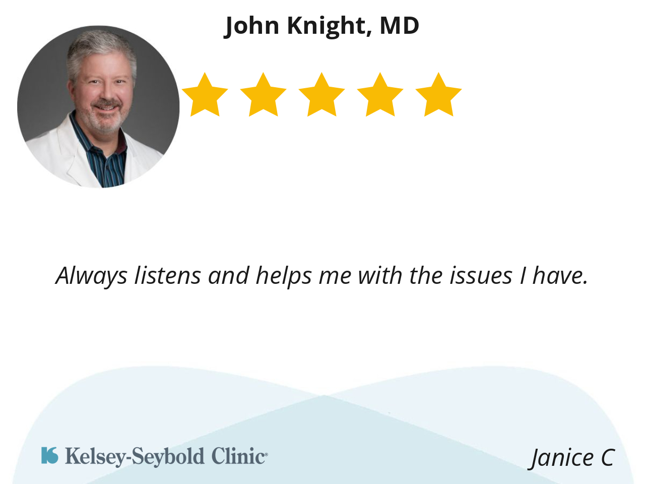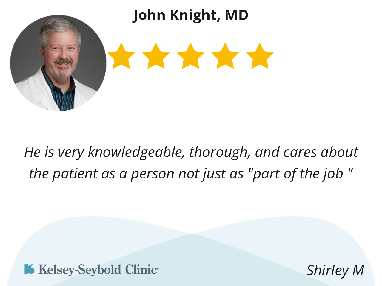 Dr knight is caring; he listens well; he explains everything well; he’s very knowledgeable and takes his time with you. He’s just a great doctor and human being.