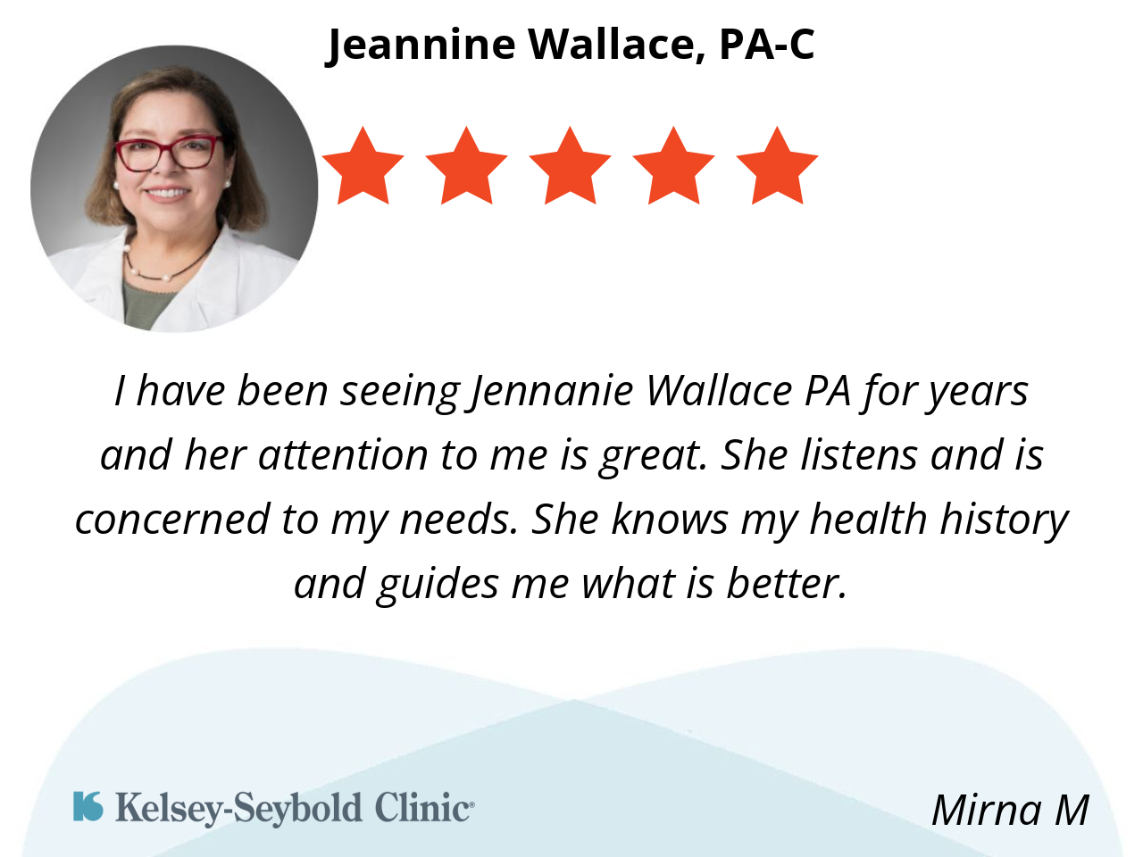 I have been seeing Jennanie Wallace PA for years and her attention to me is great. She listens and is concerned to my needs. She knows my health history and guides me what is better.