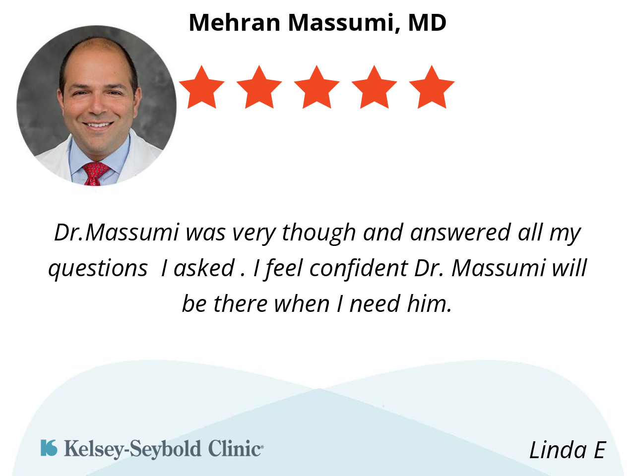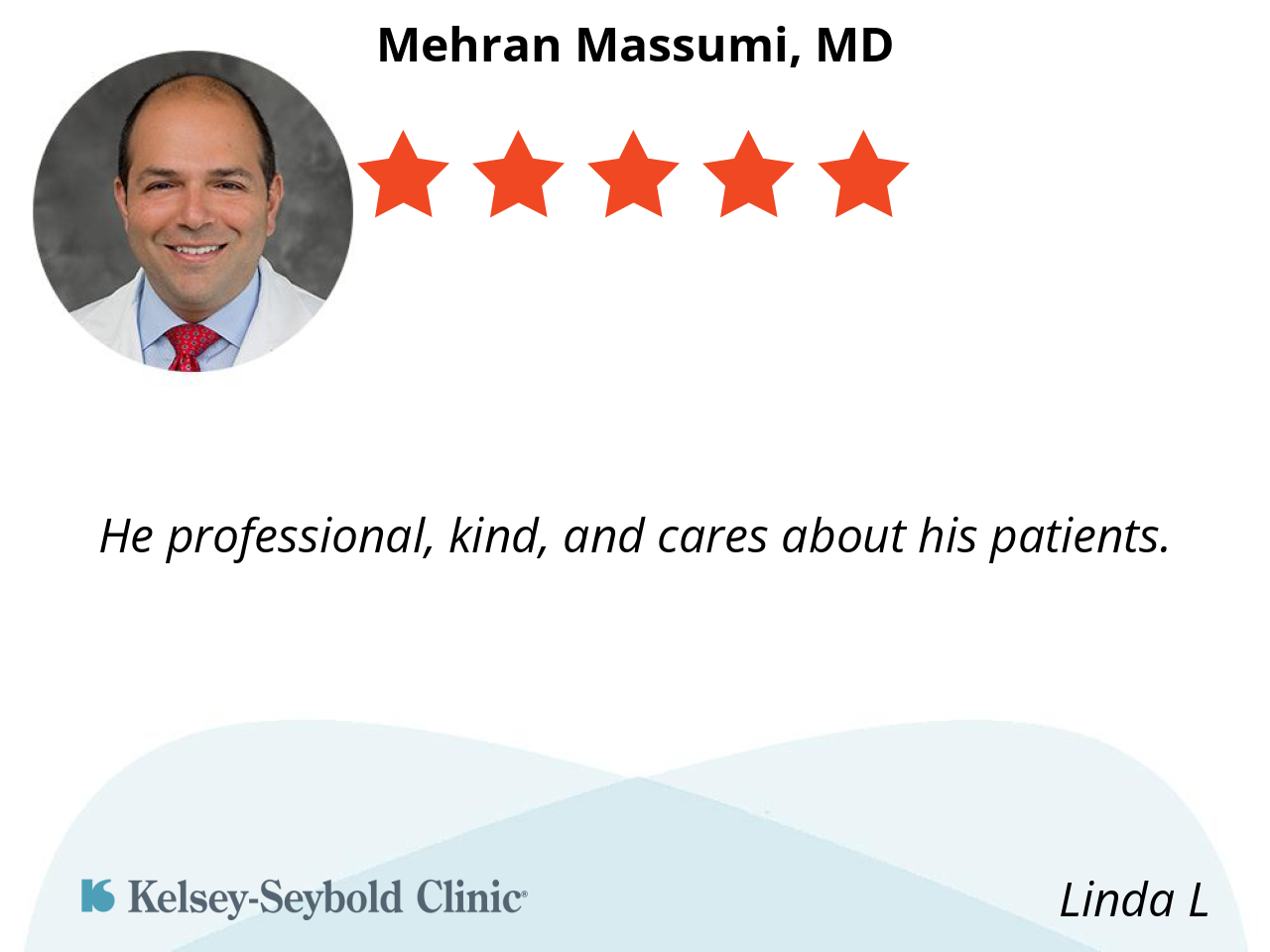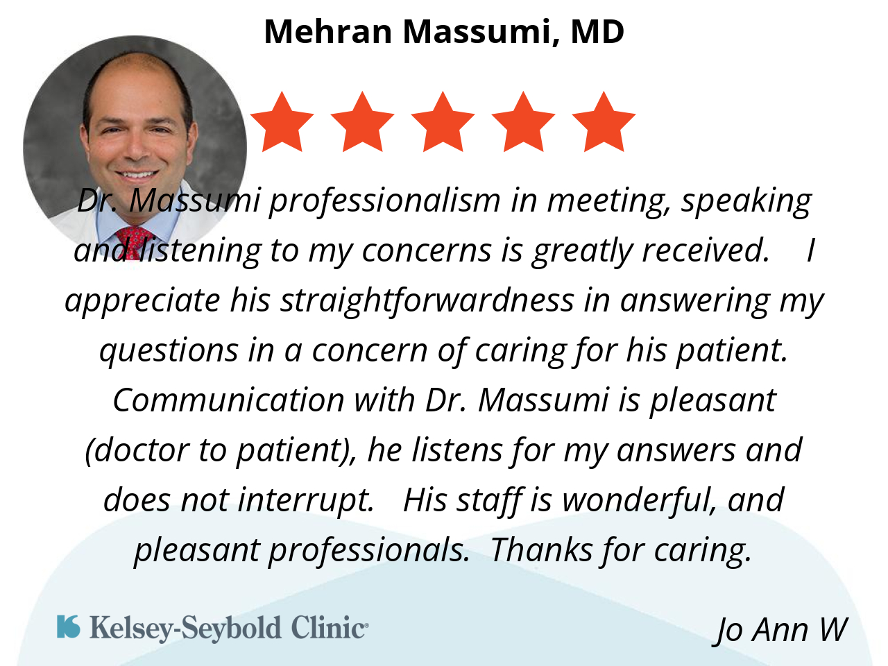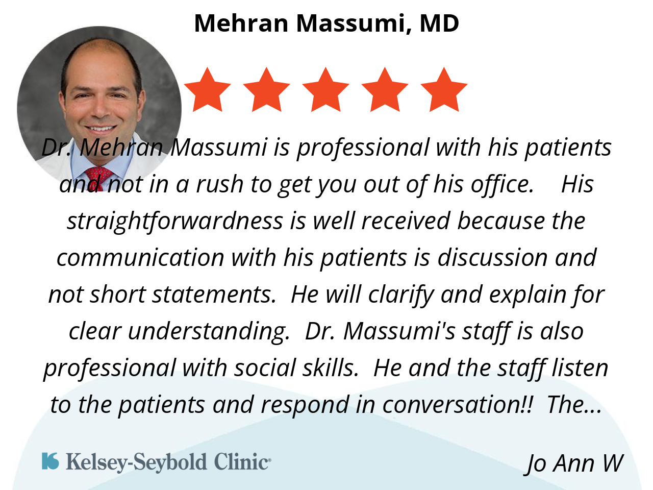 Dr. Massumi is very professional, knowledgeable and compassionate. He listens attentively to my concerns and I'm quite comfortable in asking questions. I have a rare auto-immune disease which requires me to me multi specialalists. Dr. Massumi is always prepared for my visits by keeping abreast of the plan of care by the others on my care team. I'm so grateful for the excellent care that I have receive at Kelsey-Seybold over the years. I will continue to recommend this institution and it's staff every chance I get!!!
