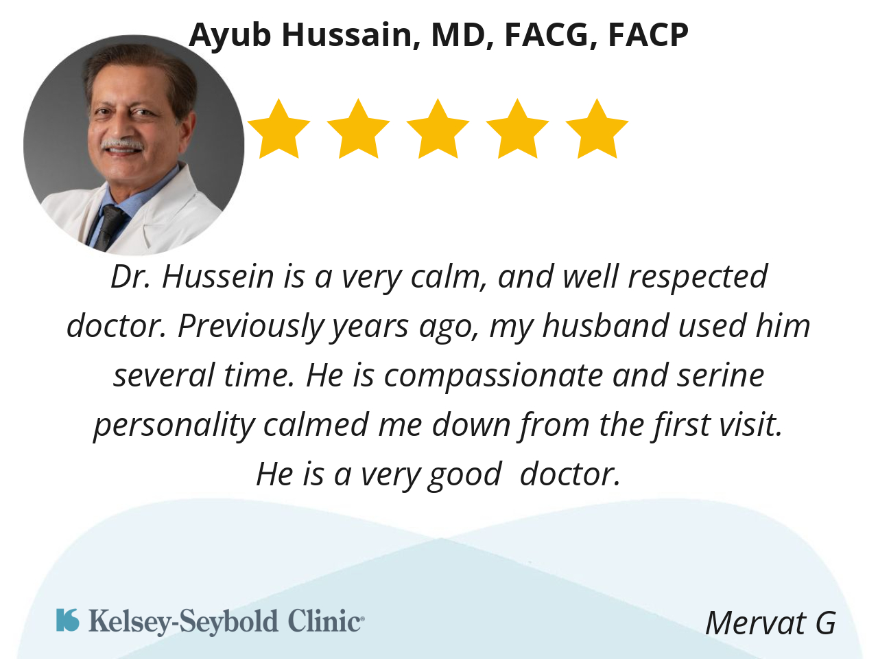 Dr. Hussein is a very calm, and well respected doctor. Previously years ago, my husband used him several time. He is compassionate and serine personality calmed me down from the first visit.