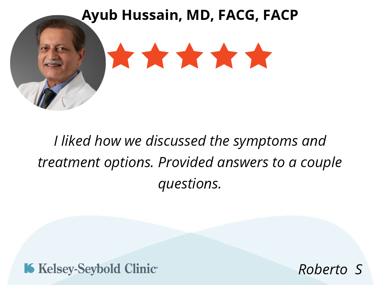 Dr. Hussain was respectful. Professional and at the same time considerate. He seemed to be approachable and not standoffish. I thought he was nice