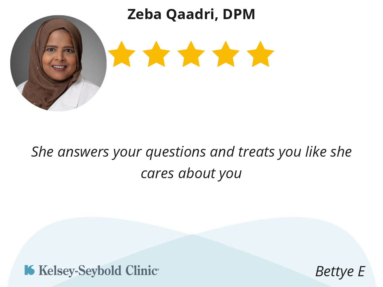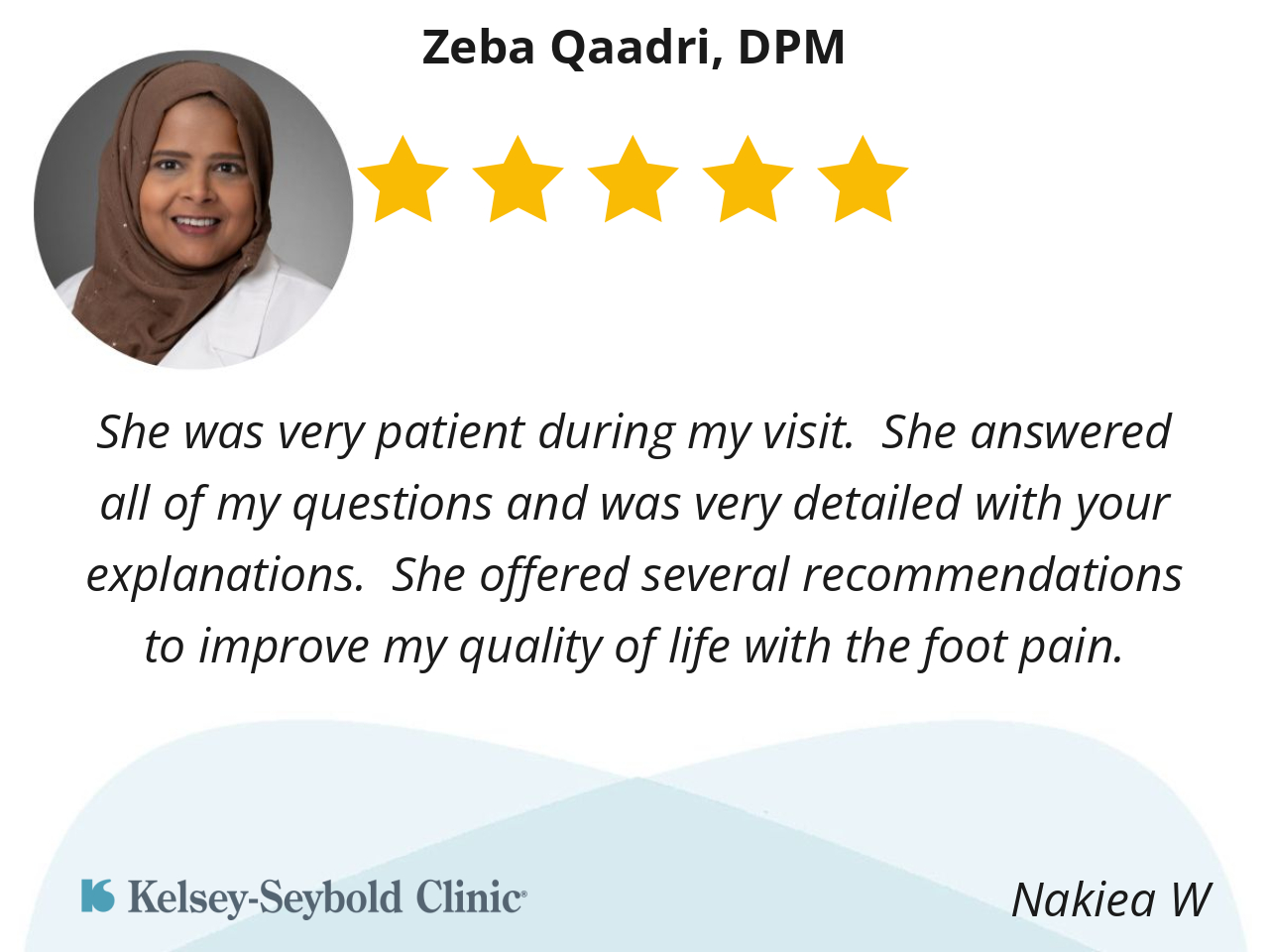Dr. Zeba was just wonderful and she explained everything very well and gave me good advice. I would recommend her to anyone.