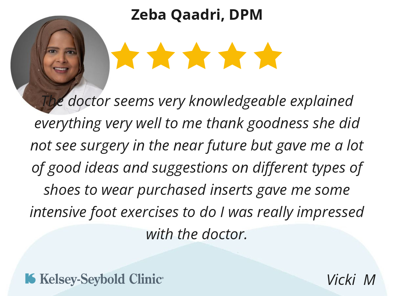 The doctor seems very knowledgeable explained everything very well to me thank goodness she did not see surgery in the near future but gave me a lot of good ideas and suggestions on different types of shoes to wear purchased inserts gave me some intensive foot exercises to do I was really impressed with the doctor.