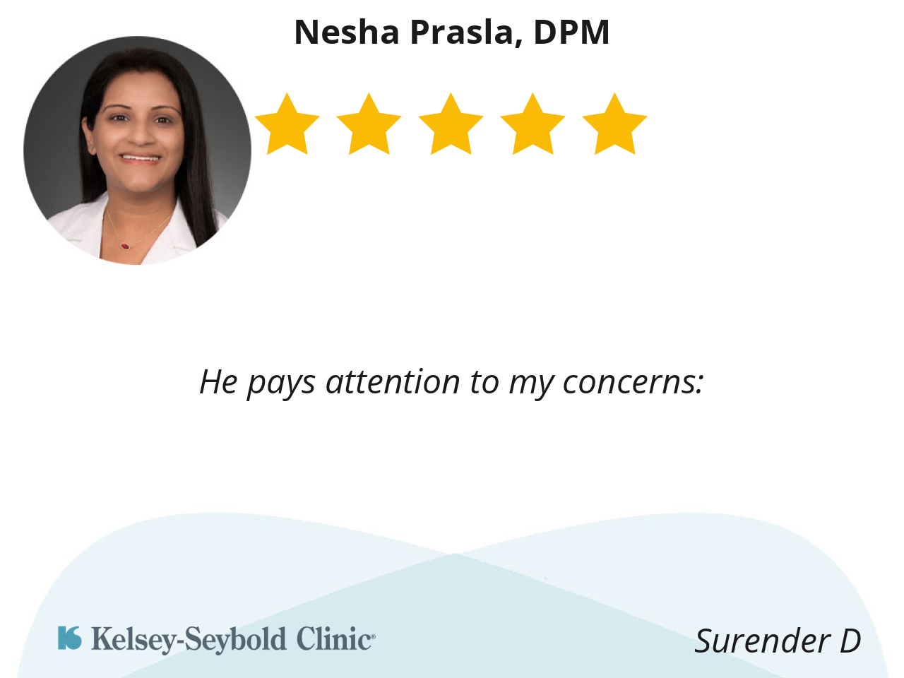 I would recommend Dr Prasla whole-heartedly. She listened, and was respectful, then explained twice until I understood what was going on and what needed done.