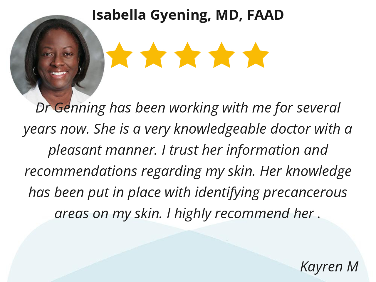 Dr.Gyening is an excellent Physcian she listens so tenatively and knows how to correct your ailment .She is my Dermatologist for life. Kelsy Seyboyld is blessed to have her.
