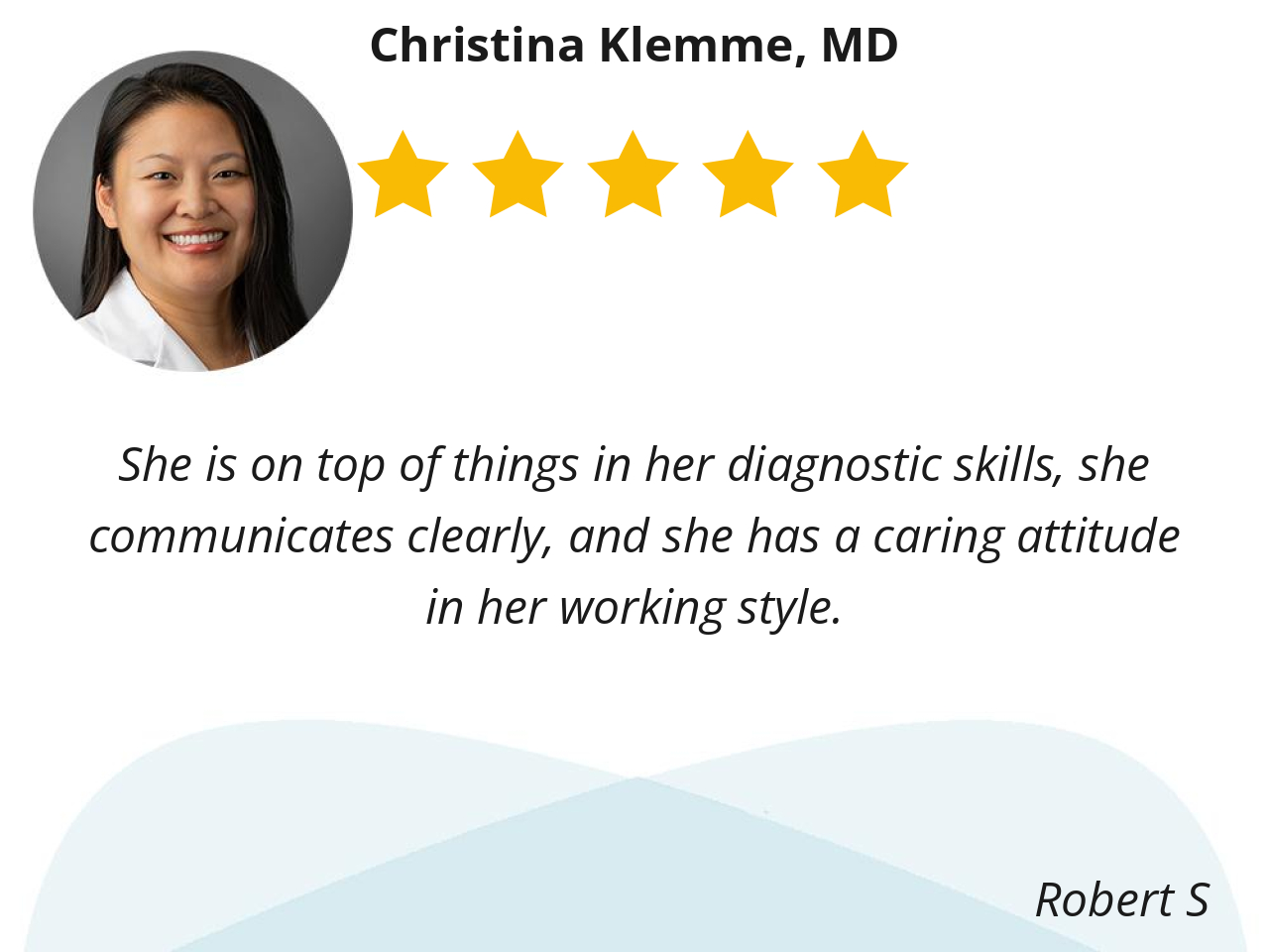 Christina Klemme, MD is very kind , thorough and she listens to my concerns and answers my questions.