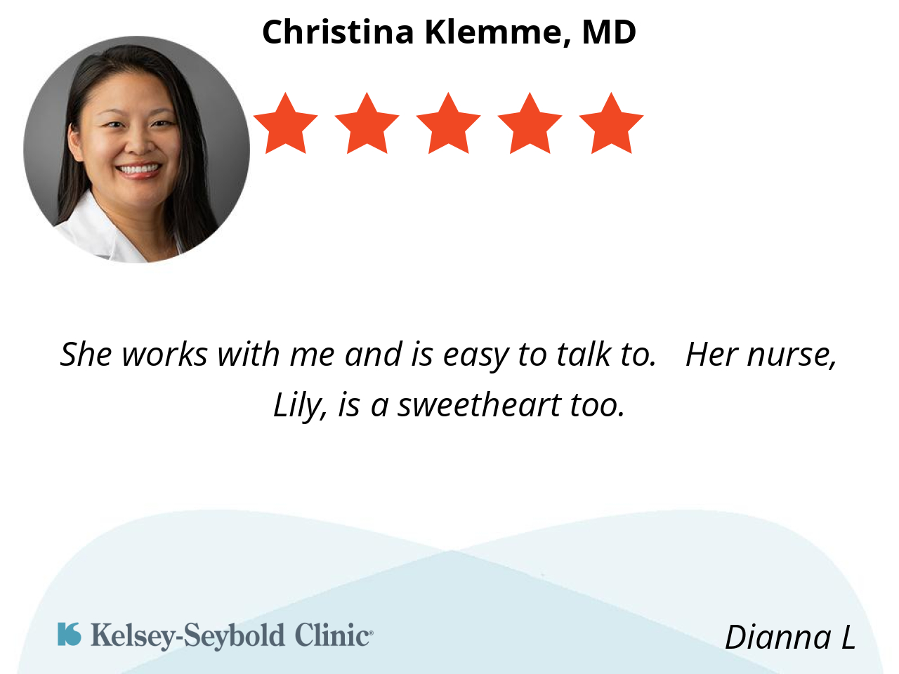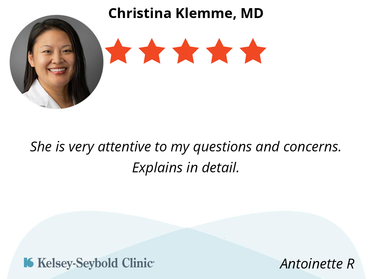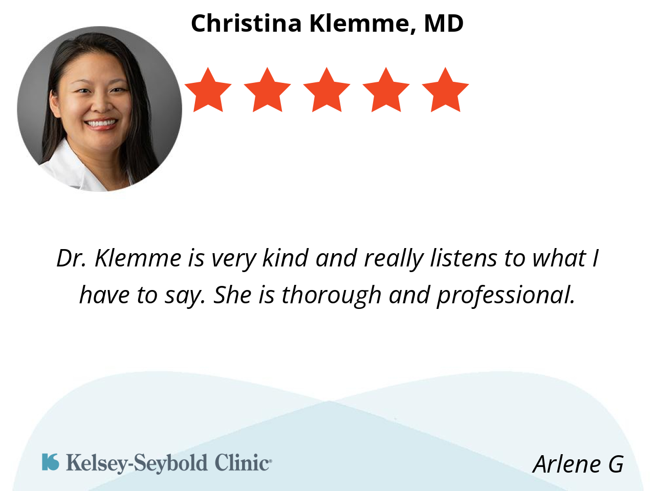 I had a different doctor for about 10 years. Two years ago, I chose Kelsey and became Dr. Klemme's patient. Dr. Klemme is very patient, answers my questions, and explains things in a way that I can understand. I am Japanese and elderly, so it was difficult for me to communicate with my doctor in the past. Dr. Klemme is a wonderful doctor who clearly explains my health condition. I respect Dr. Klemme very much. Reiko Smith