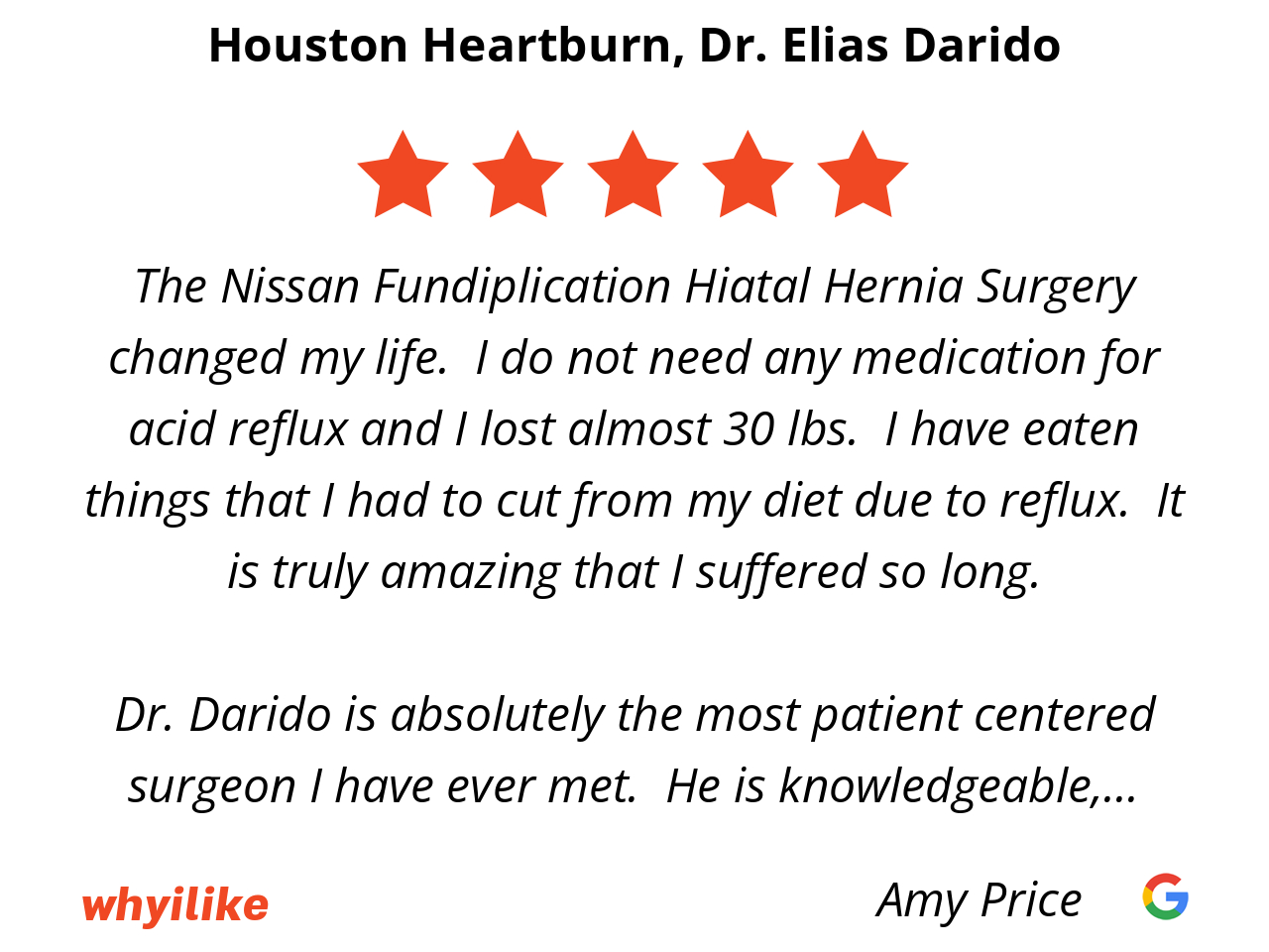 I would recommend the Houston Heartburn and Reflux Center to anyone who may need a Nissen Funcoplication. In my experiences, Dr. Darido has been one of the best surgeons I’ve gone to, and I’m grateful for his quality work.