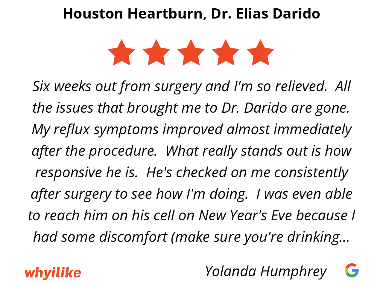 I wish I had contacted Dr Darido sooner. I suffered (and I mean suffered horribly) with GERD for at least 20 years. The last ten were absolute hell. Finally I got sick of many doctors not listening to me and went to Houston to meet Dr Darido. I was scheduled for the required tests very quickly, and then for surgery. The experience was very seamless and trouble-free. I'm not going to lie, the recovery was tough but I made it through and have been REFLUX-FREE FOR OVER A YEAR! Zero side effects and feel about a billion times better than I did before. If you or someone you know are suffering from reflux/GERD/hiatal hernia, do not delay. Seriously, call these people and THEY WILL HELP YOU. I cannot thank him and his staff enough. My life is seriously changed forever, for the better. Thanks again folks!