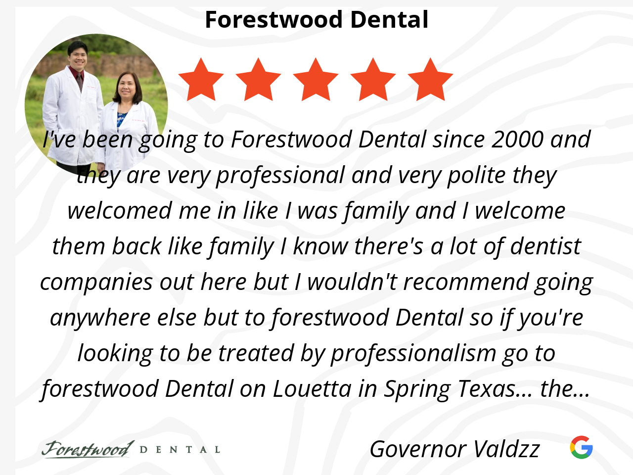 I've been going to Forestwood Dental since 2000 and they are very professional and very polite they welcomed me in like I was family and I welcome them back like family I know there's a lot of dentist companies out here but I wouldn't recommend going anywhere else but to forestwood Dental so if you're looking to be treated by professionalism go to forestwood Dental on Louetta in Spring Texas... the owner and the staff are awesome people... so go there for your best smile😁