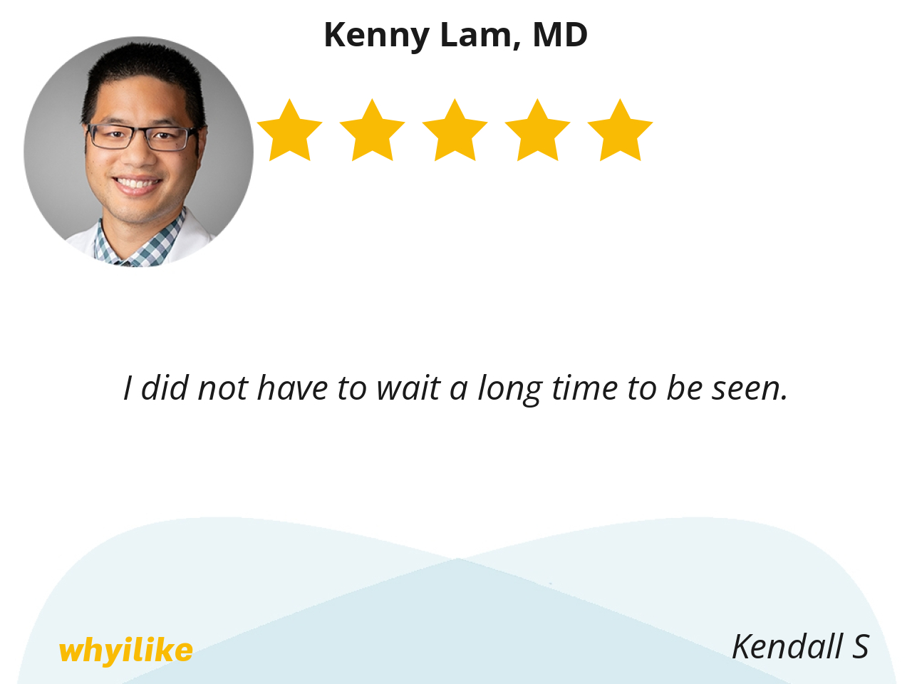 After getting n MRI, the techs encouraged me to see a doctor, soonest, so i called your urgent care, to see if i could get to a doctor concerning my hand, deep cat scratch, swollen (could not move my fingers) throbbing, hot to the touch, quite painful. They fit me in to see Dr Lam, same location, in a few hours. Dr Lam saw me early, assessed the hand, asked the right questions and prescribed antibiotics. Next day and i am 50% better, after a few doses of antibiotics. I would see him again, and appreciate how swiftly the Kelsey process got me to a doctor with little stress. He was efficient, gentle and listened attentively. Great experience overall.