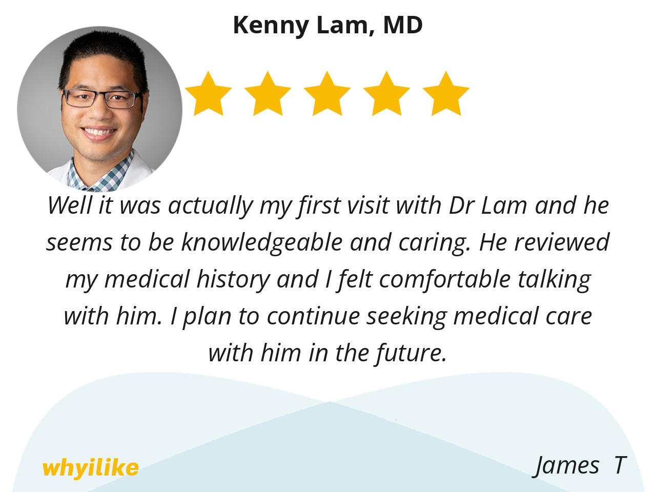 Well it was actually my first visit with Dr Lam and he seems to be knowledgeable and caring. He reviewed my medical history and I felt comfortable talking with him. I plan to continue seeking medical care with him in the future.