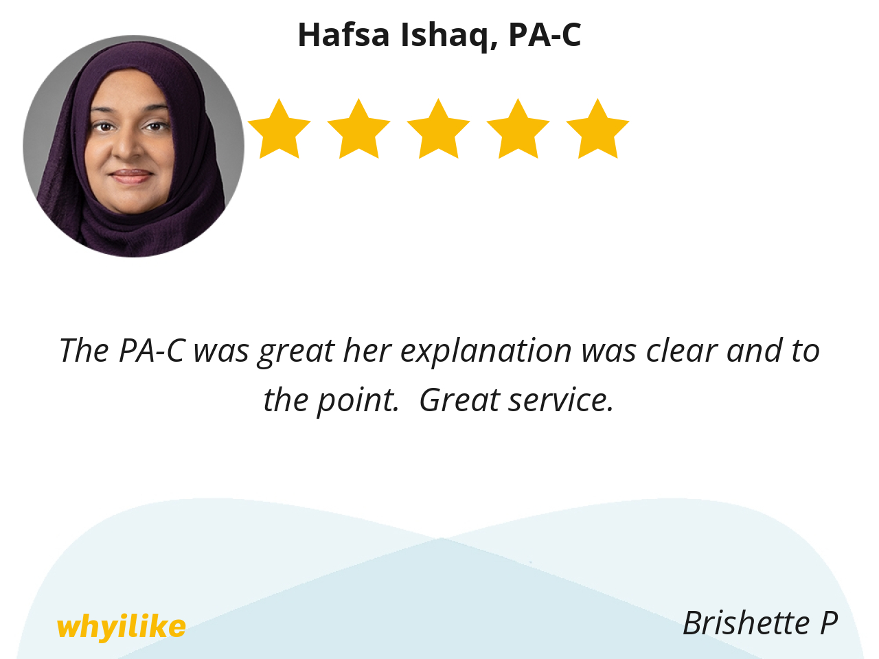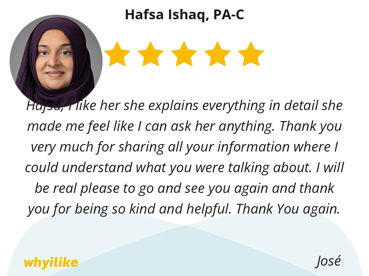 Hafsa, I like her she explains everything in detail she made me feel like I can ask her anything. Thank you very much for sharing all your information where I could understand what you were talking about. I will be real please to go and see you again and thank you for being so kind and helpful. Thank You again.