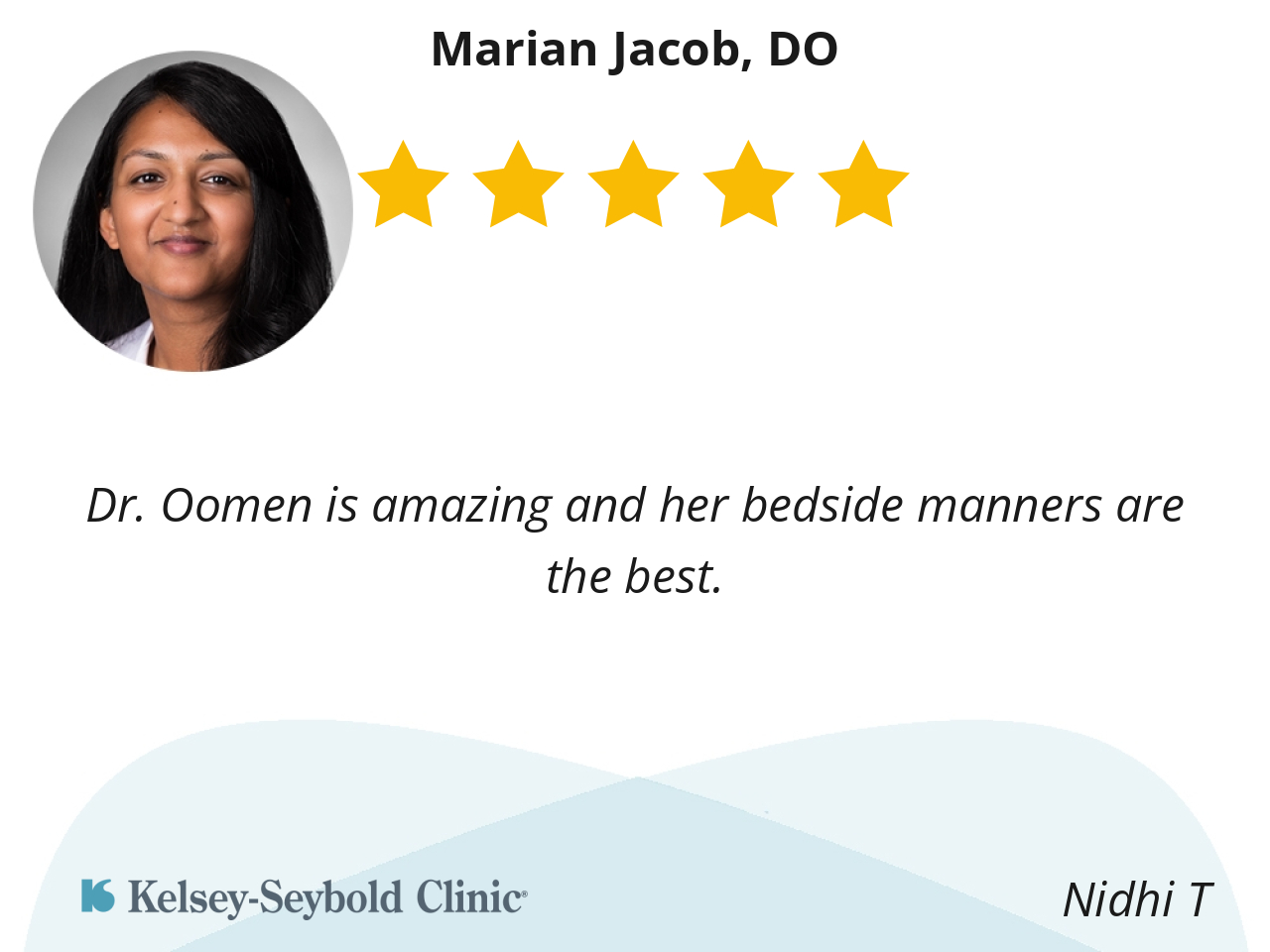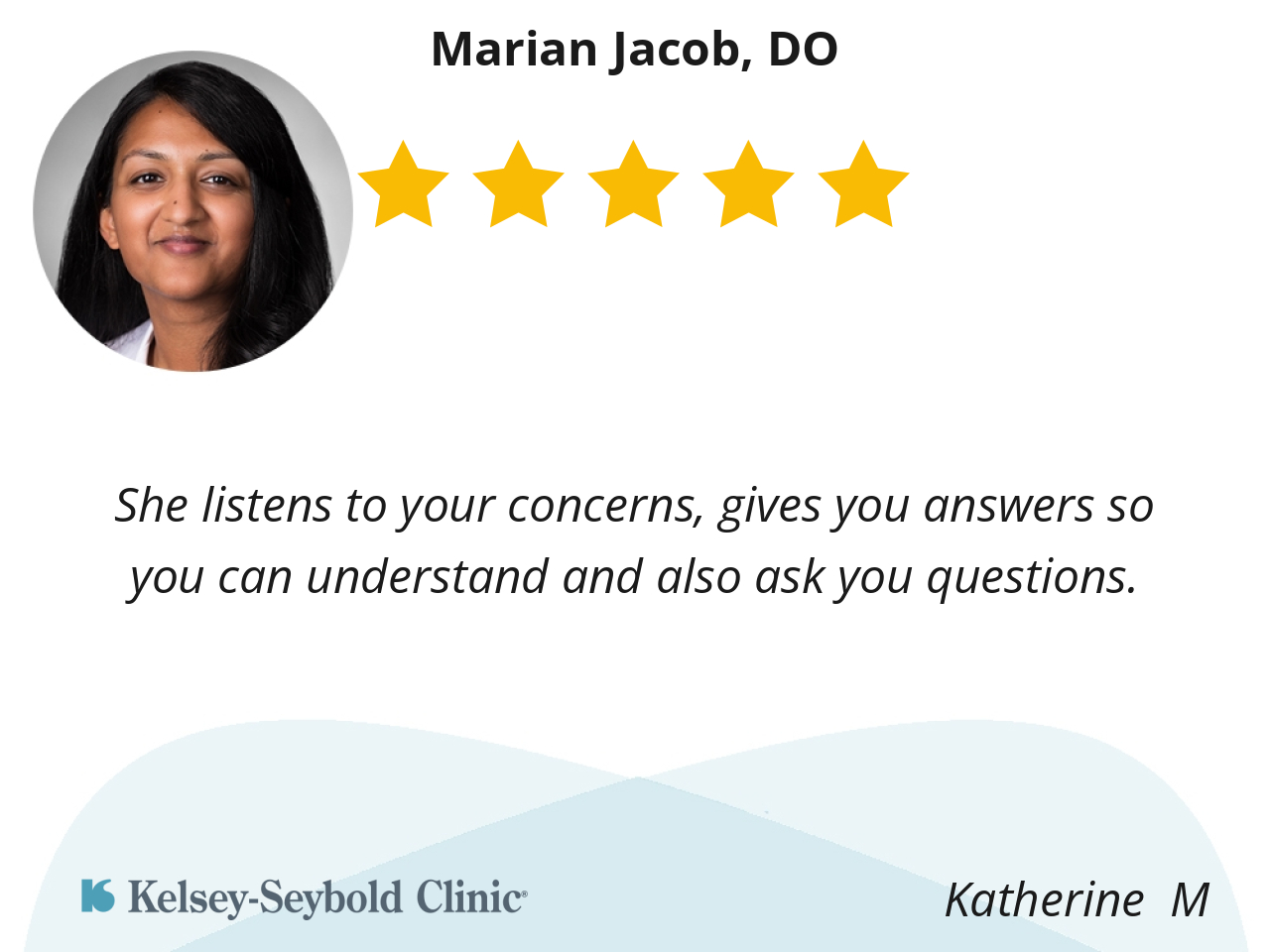 Dr. Jacob is knowledgeable, compassionate, and communicative. I appreciated her deep understanding of current gold-standard practices and of the most recent scientific consensus on medical topics. I am delighted to have her as my primary care provider and to have her continuing support for my medical challenges.
