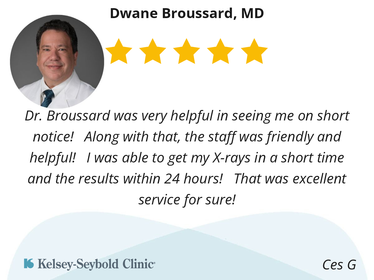 Dr. Broussard was very helpful in seeing me on short notice! Along with that, the staff was friendly and helpful! I was able to get my X-rays in a short time and the results within 24 hours! That was excellent service for sure!