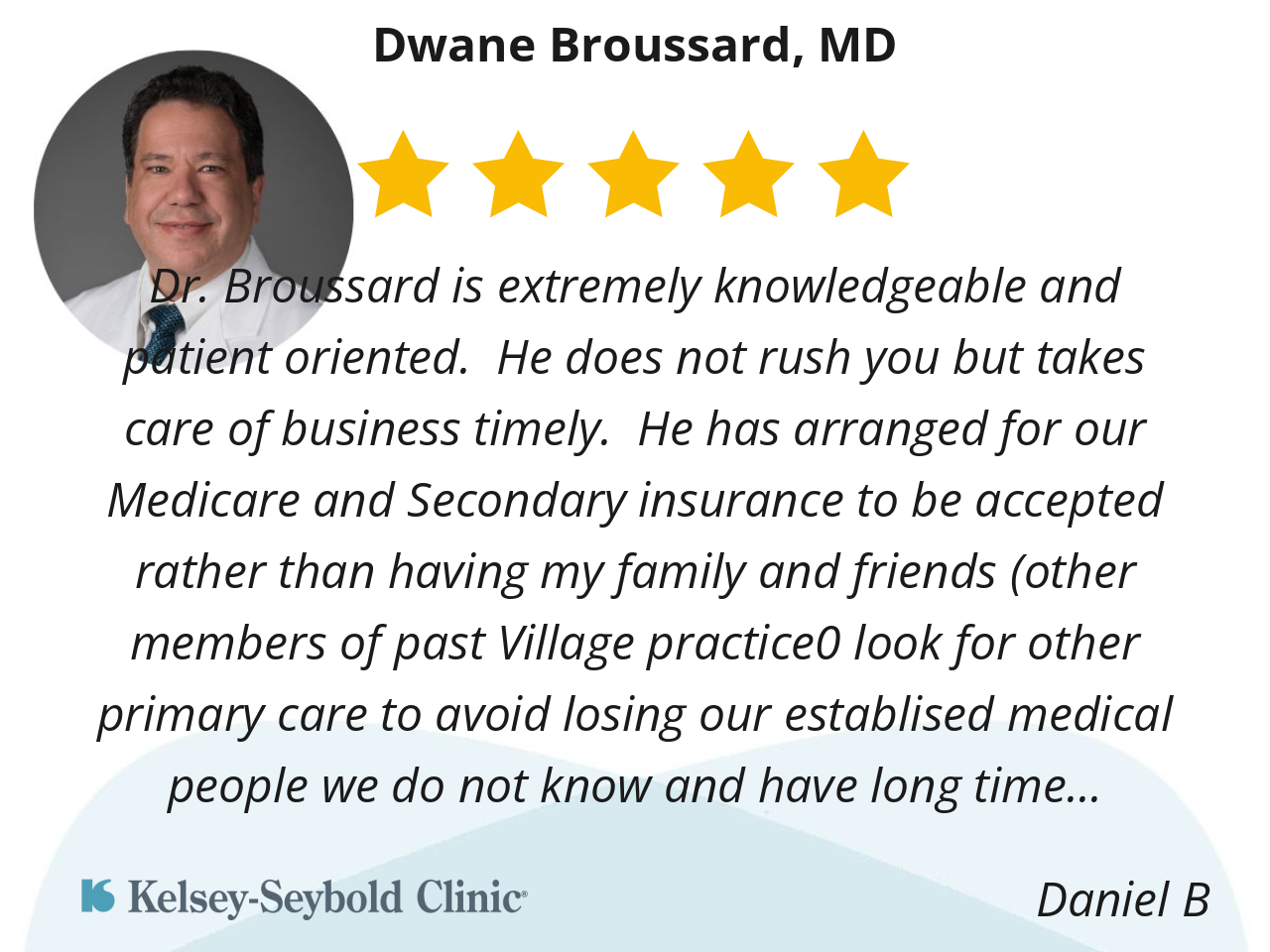 Dr. Broussard is extremely knowledgeable and patient oriented. He does not rush you but takes care of business timely. He has arranged for our Medicare and Secondary insurance to be accepted rather than having my family and friends (other members of past Village practice0 look for other primary care to avoid losing our establised medical people we do not know and have long time relationship with. Extremely good service.