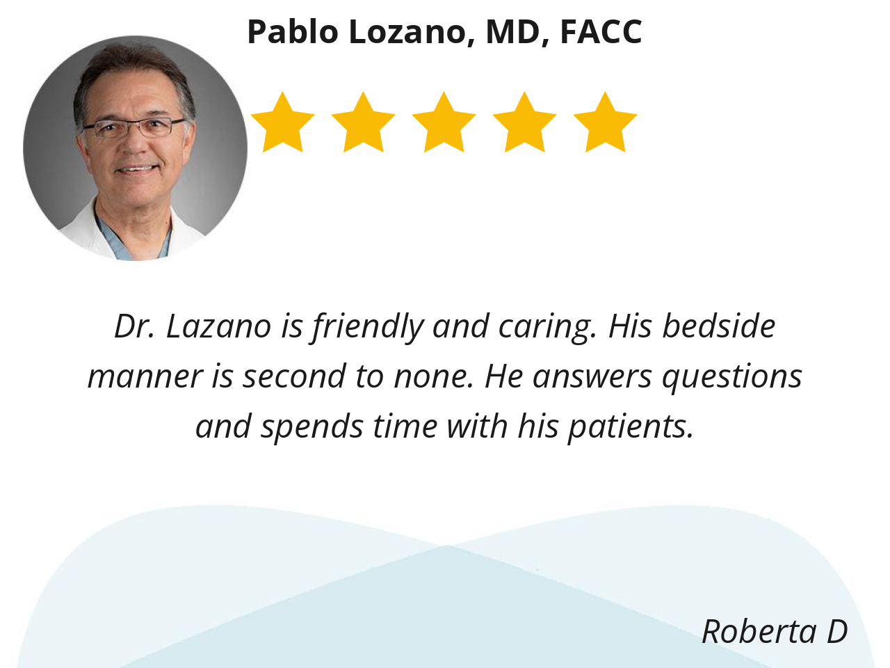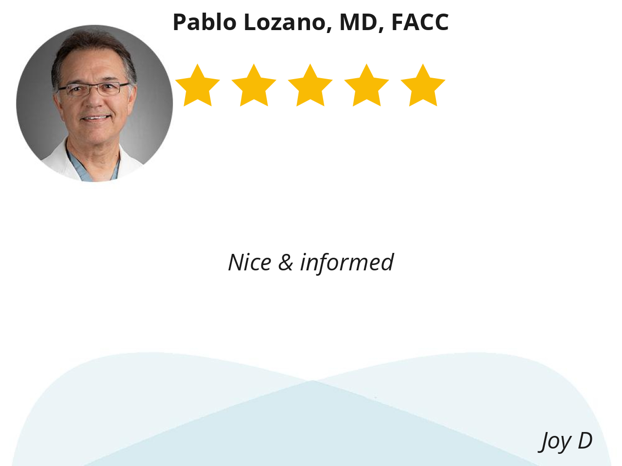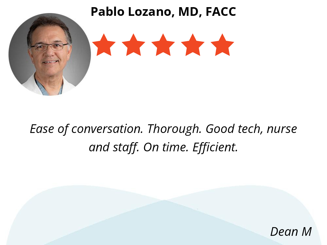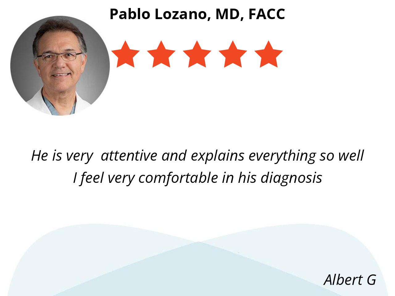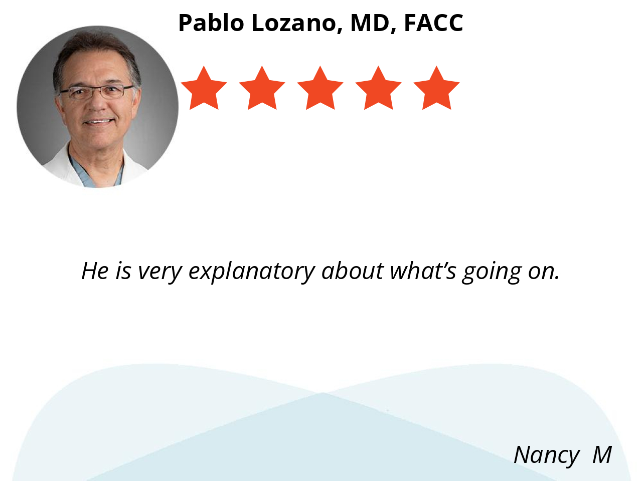 Doctor Lozano has been my Cardiologist meany years. Easy to talk to and listen and hears your concerns and needs . Straight forward communication. He is a busy precessional position who will meet you at your level of care.