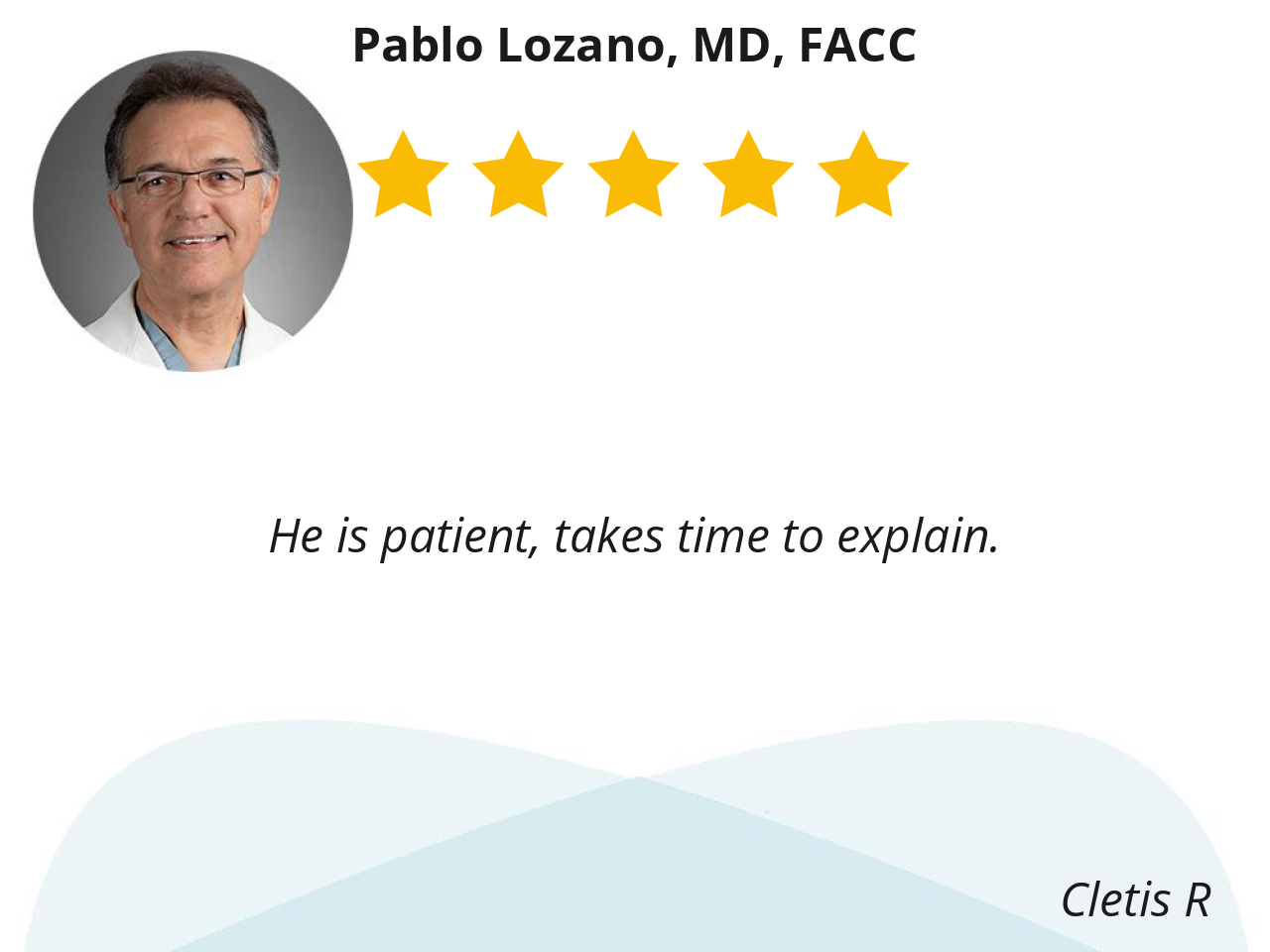 Dr. Lozano has solid experience and knowledge of cardiovascular diseases. He patiently listens to patients explain their conditions and clearly explains how to take medications. I am very lucky to be his patient.