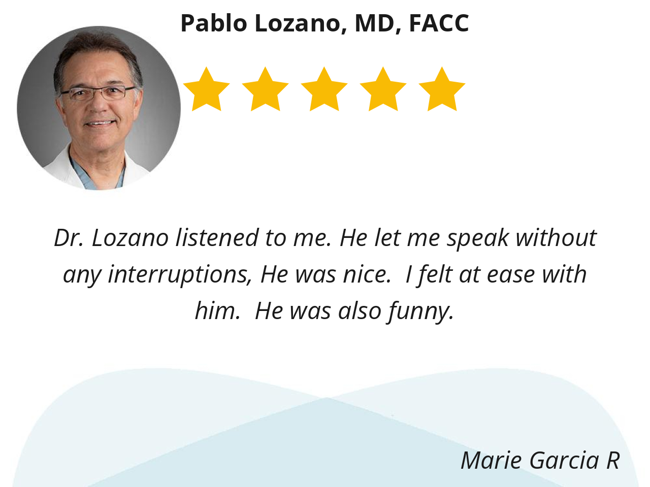 Dr. Lozano listened to me. He let me speak without any interruptions, He was nice. I felt at ease with him. He was also funny.