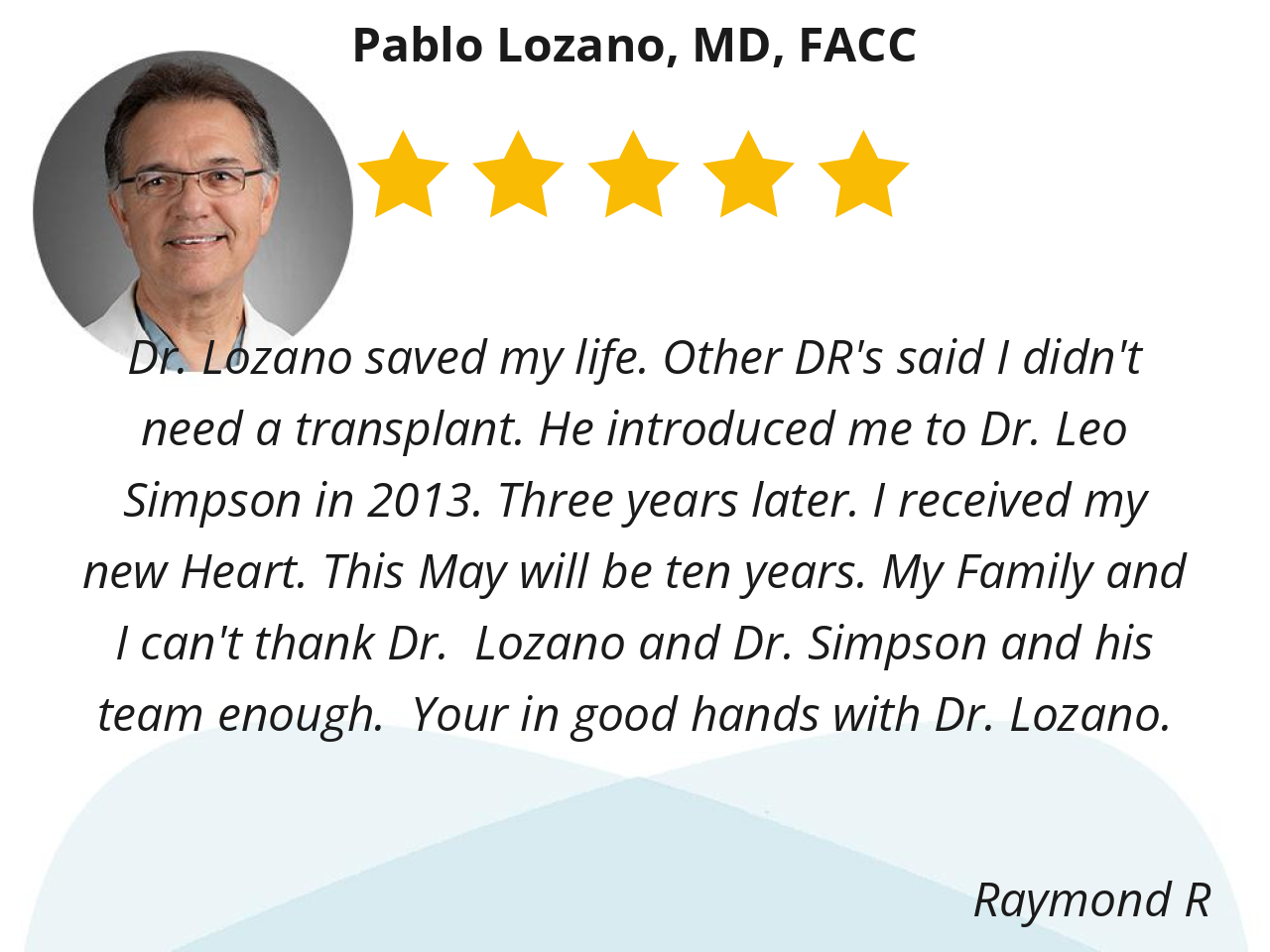 Dr. Lozano saved my life. Other DR's said I didn't need a transplant. He introduced me to Dr. Leo Simpson in 2013. Three years later. I received my new Heart. This May will be ten years. My Family and I can't thank Dr. Lozano and Dr. Simpson and his team enough. Your in good hands with Dr. Lozano.