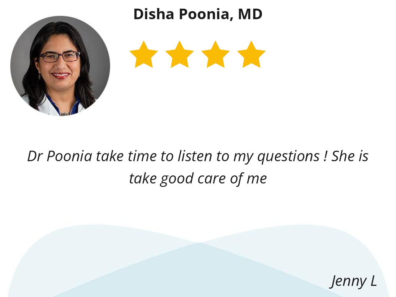 Dr. Poonia & her staff are friendly, efficient & engaging. I feel like she’s invested my overall health & wellbeing.