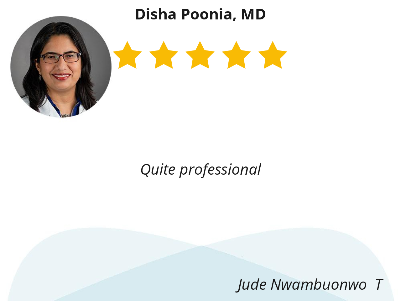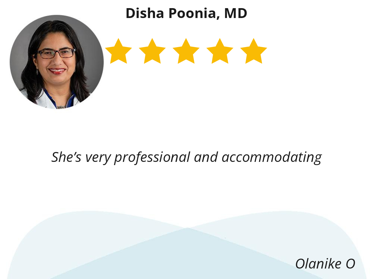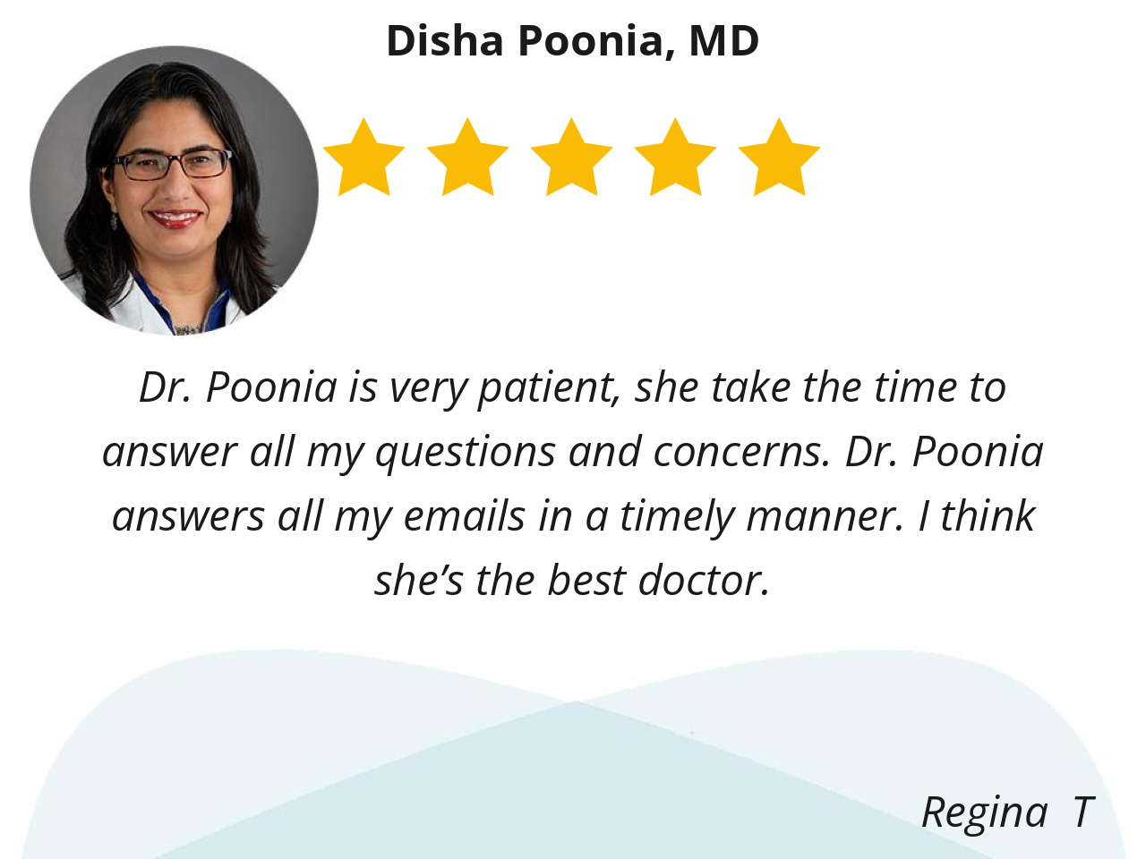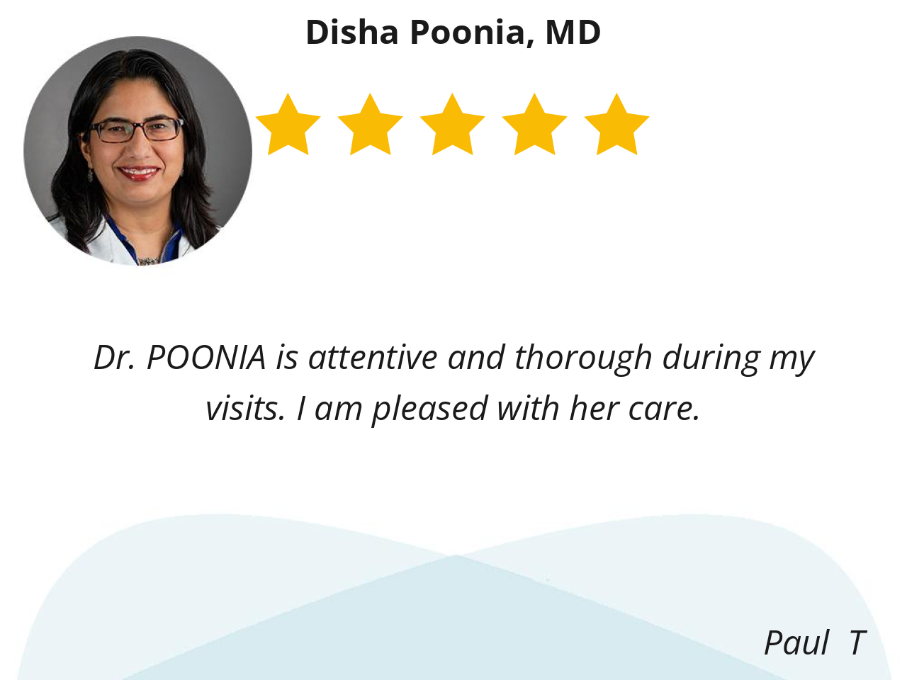 Dr. Poonia is very patient, she take the time to answer all my questions and concerns. Dr. Poonia answers all my emails in a timely manner. I think she’s the best doctor.
