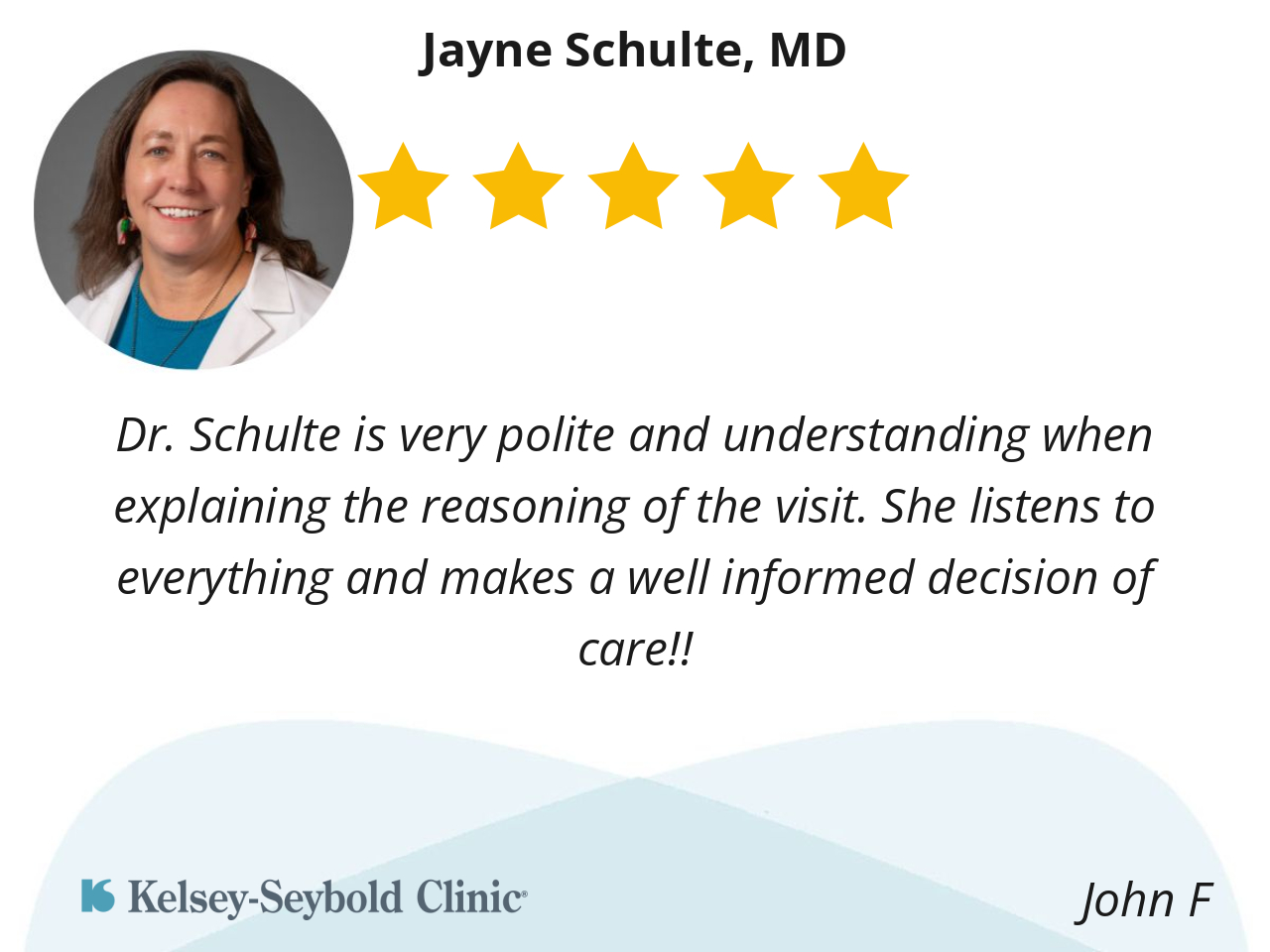 Dr. Schulte is very polite and understanding when explaining the reasoning of the visit. She listens to everything and makes a well informed decision of care!!