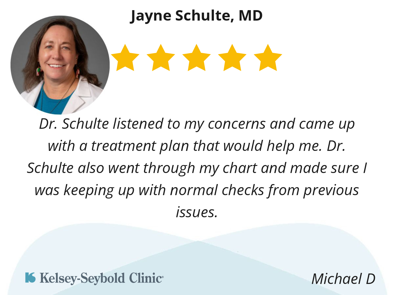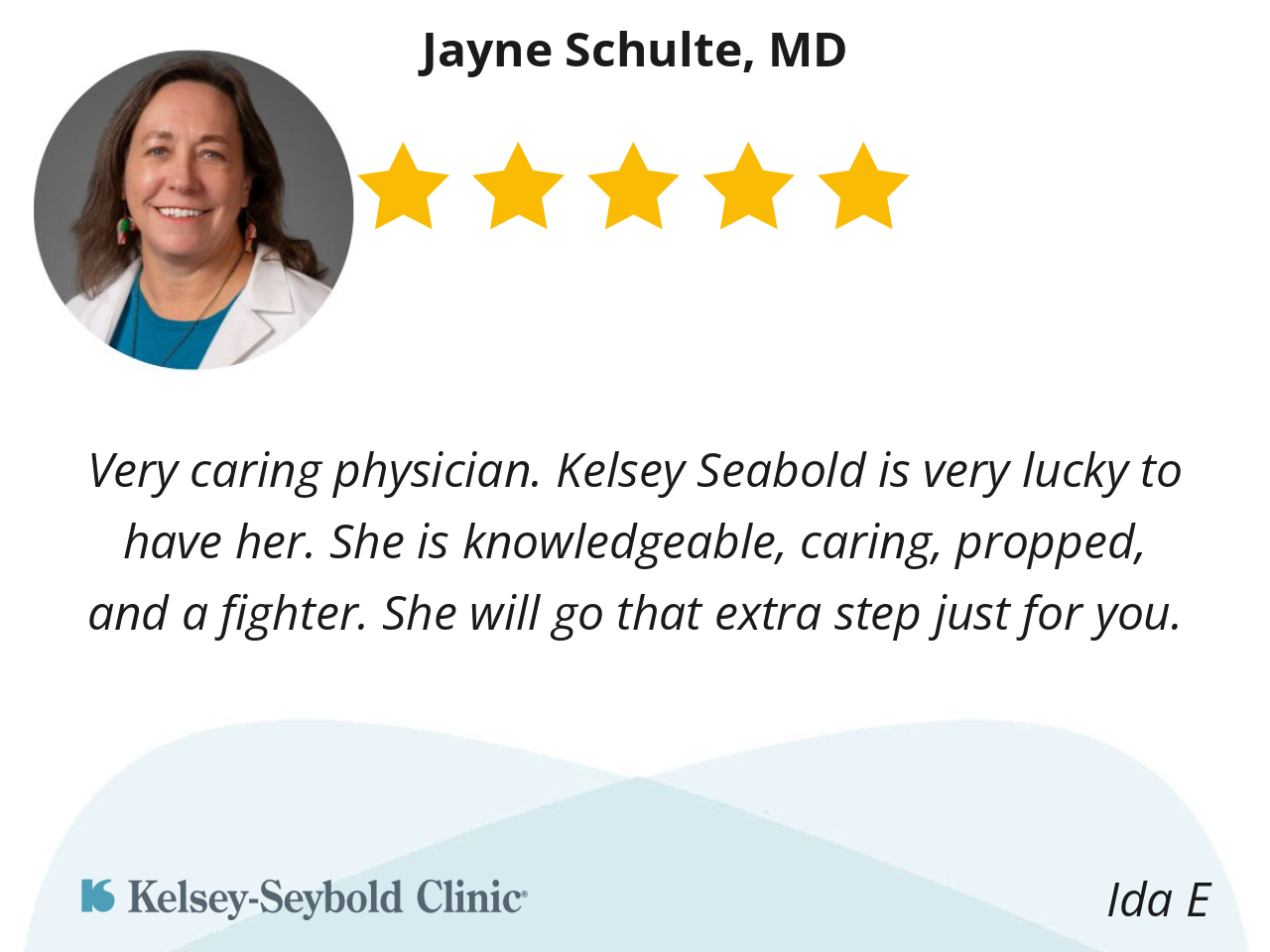 Dr Schulte is a definite 10. She is a very caring, knowledgeable physician. Kelsey Seaboldis very lucky to have her.