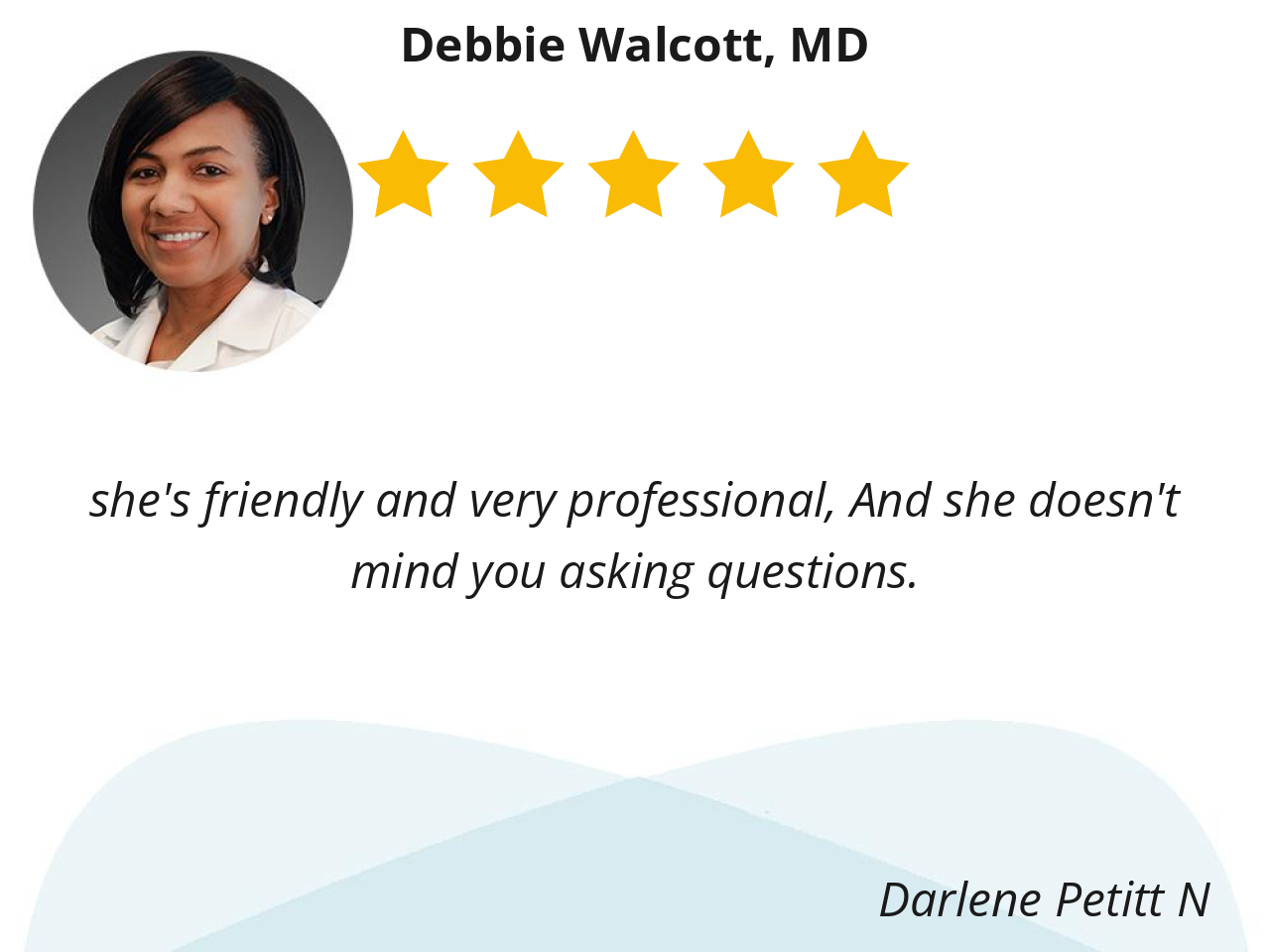 Dr. Walcott is an exceptional doctor. She's patient, kind, and deeply cares about my overall well-being! She's the best! Top-notch care!!