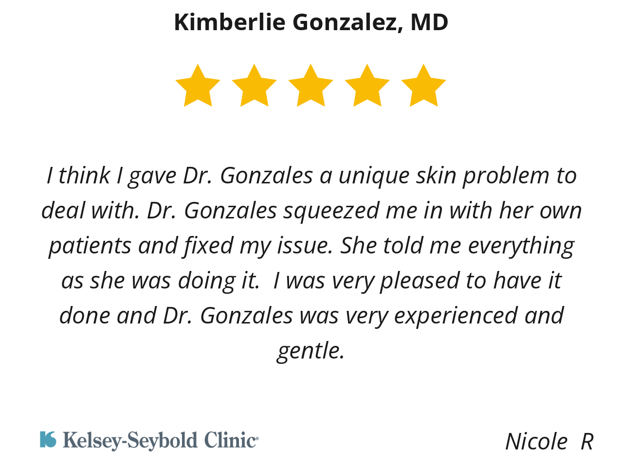 I think I gave Dr. Gonzales a unique skin problem to deal with. Dr. Gonzales squeezed me in with her own patients and fixed my issue. She told me everything as she was doing it. I was very pleased to have it done and Dr. Gonzales was very experienced and gentle.