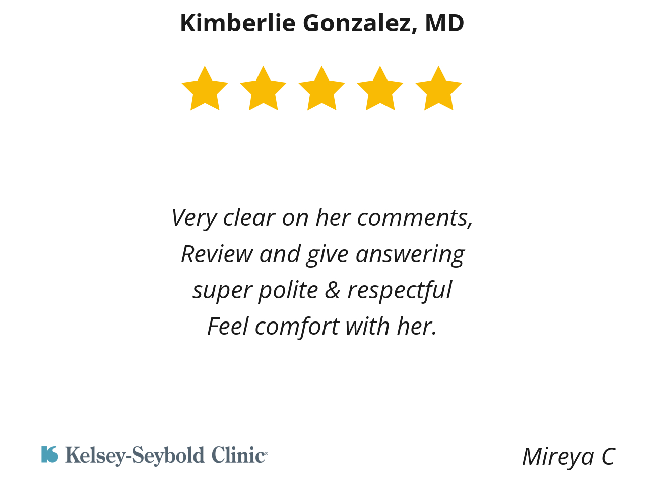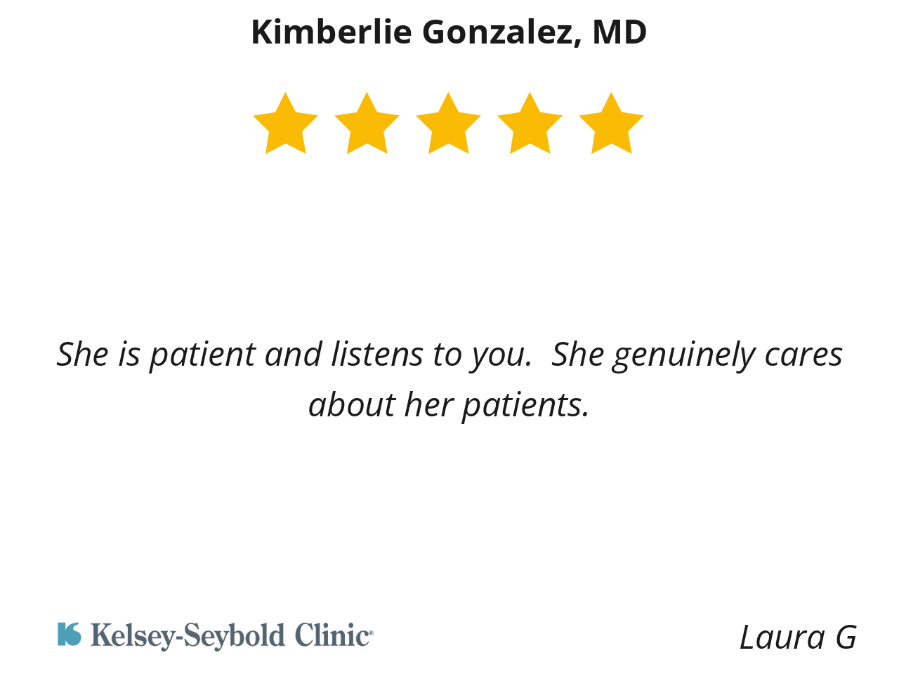 Doctor Kimberly Gonzalez is amazing! She’s so thorough during visits and her bedside manner is superb