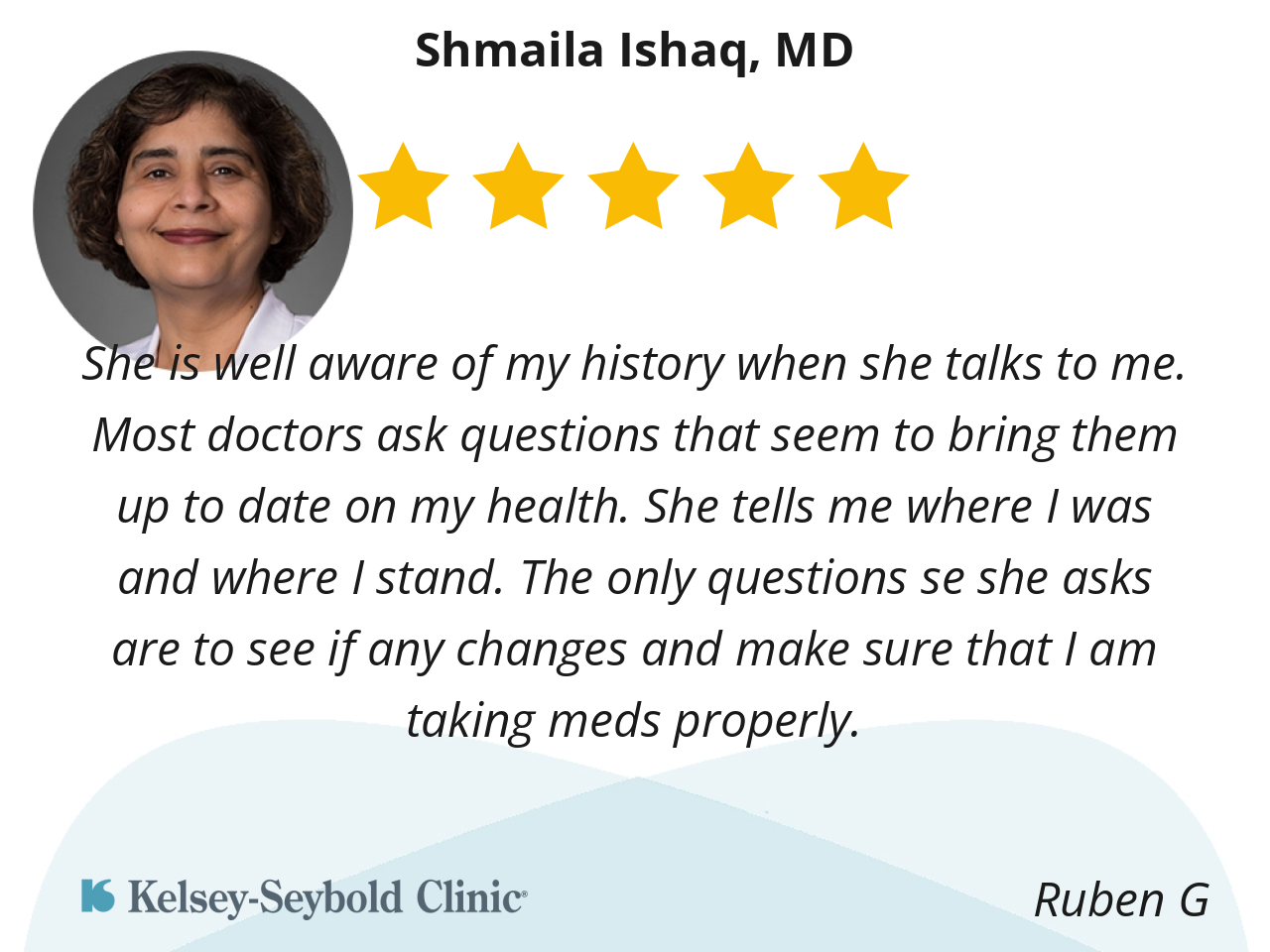 Dr. Ishaq is very personable and takes her time with you. I can ask her anything and she explains everything. I know I can reach out to her if need be without any hesitation.
