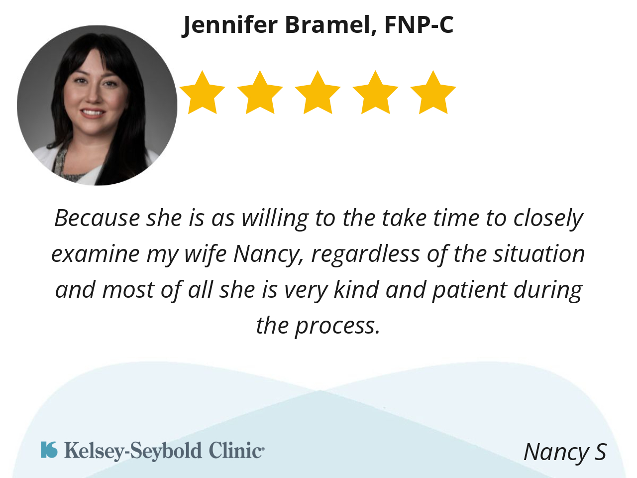 Because she is as willing to the take time to closely examine my wife Nancy, regardless of the situation and most of all she is very kind and patient during the process.
