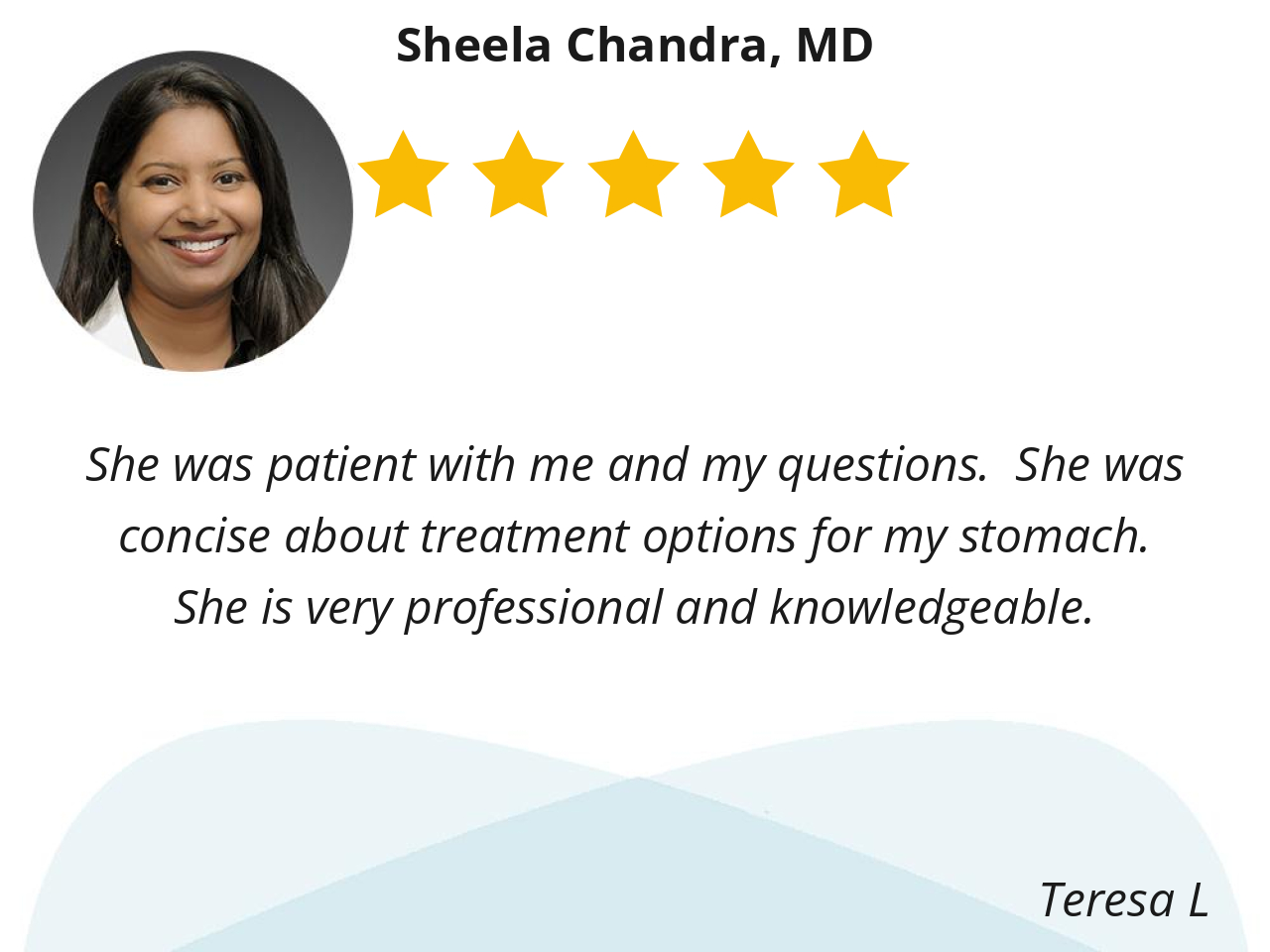 She was patient with me and my questions. She was concise about treatment options for my stomach. She is very professional and knowledgeable.