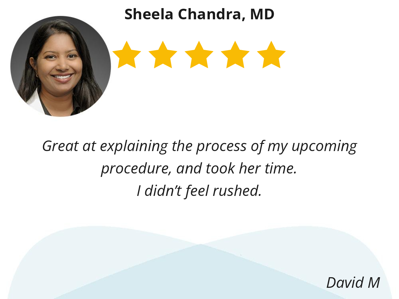 Dr. Chandra was very informative about my upcoming colonscopy and definitely made me less anxious about the procedure.