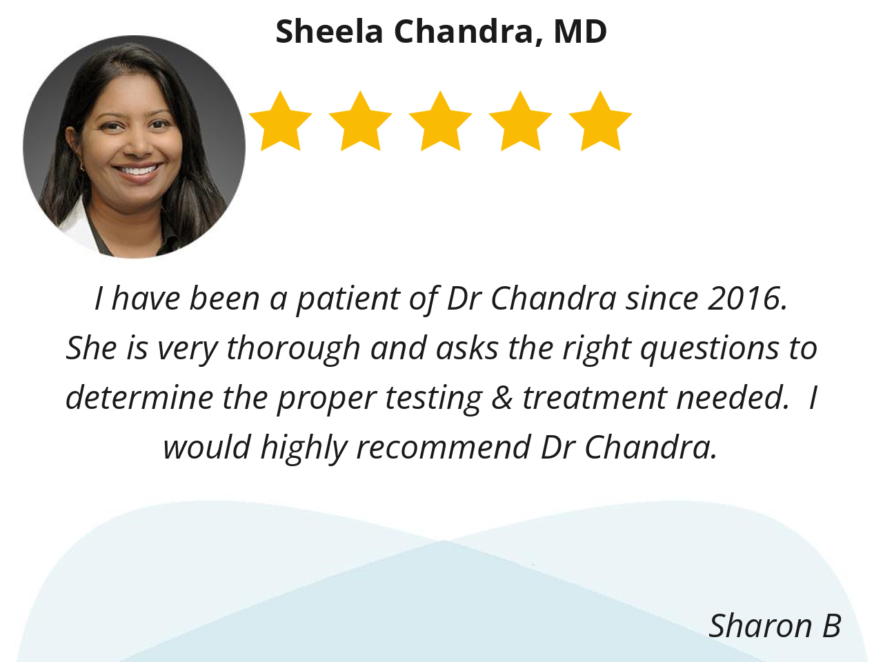 I have been a patient of Dr Chandra since 2016. She is very thorough and asks the right questions to determine the proper testing & treatment needed. I would highly recommend Dr Chandra.