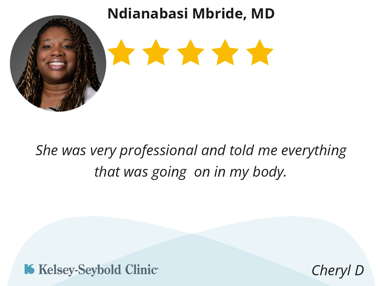 Dr. Mbride is an exceptional physician who consistently demonstrates a high level of care and professionalism. She is attentive, approachable, and always willing to answer my questions thoroughly. Her friendly and personable demeanor creates a welcoming environment, and she takes the time to ensure that I feel heard and supported during every visit. I am completely at ease in her care and highly value the trust and comfort she fosters.
