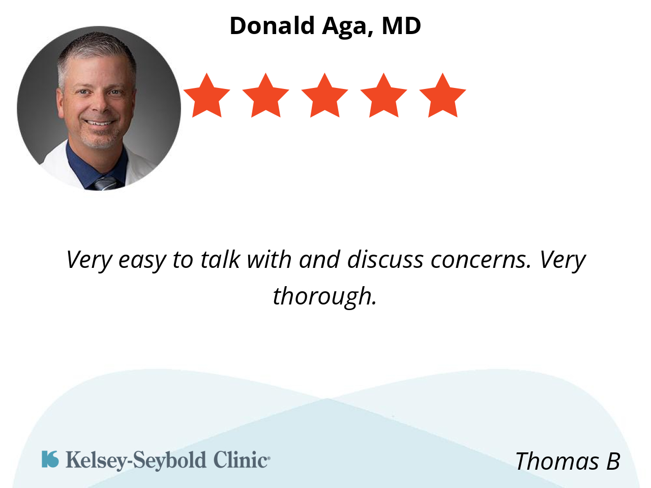 Dr. Aga is always very thorough, and we are able to talk about issues and concerns I have. He explains things in a way I can understand. Very easy to talk with.