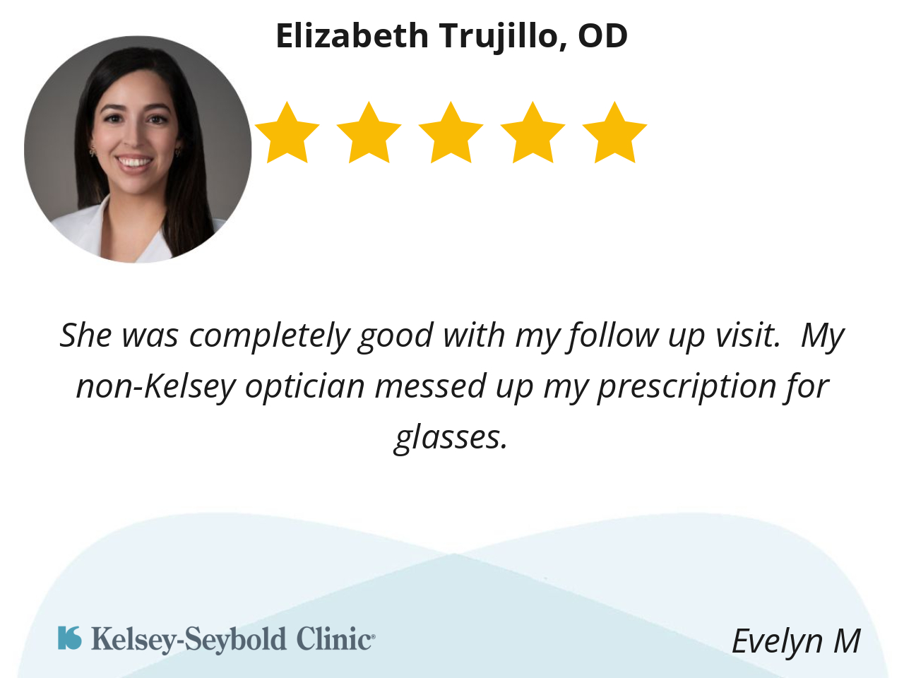 She was completely good with my follow up visit. My non-Kelsey optician messed up my prescription for glasses.