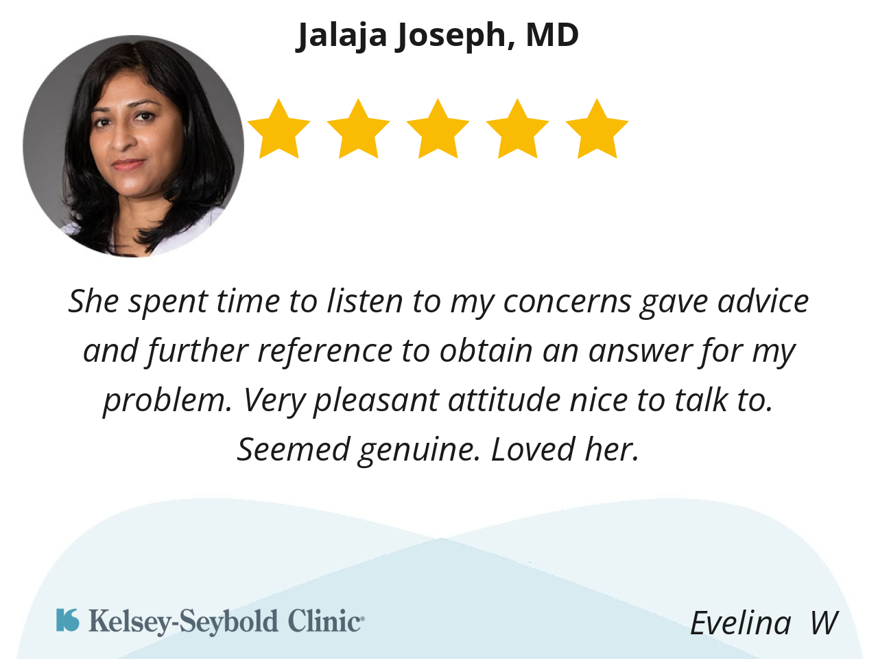 Dr. Jalaja Joseph is an absolutely wonderful endocrinologist. Her expertise and compassionate approach truly set her apart. She took the time to listen attentively, explain everything clearly, and made me feel completely at ease. I left her office feeling well-informed and confident in my treatment plan. I highly recommend Dr. Joseph for anyone seeking excellent endocrine care. Five stars