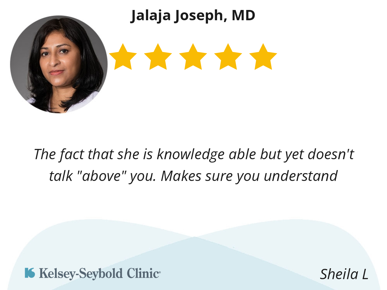 She's very professional in all she does. She is very thorough and always gives me all the information about my condition. I really appreciate her and although I could use a doctor within the Kelsey group closer to where I live, I prefer to remain with Dr. Joseph.