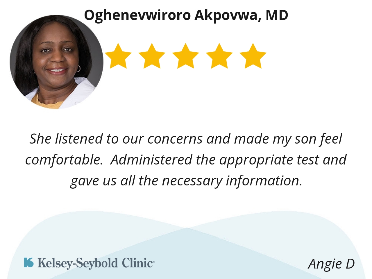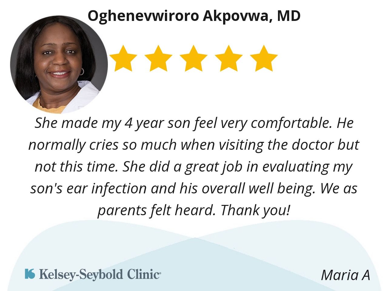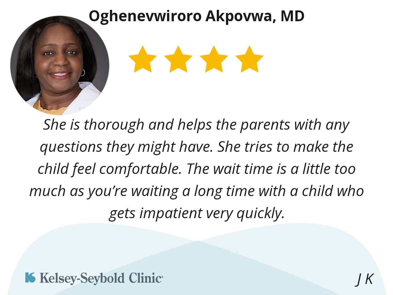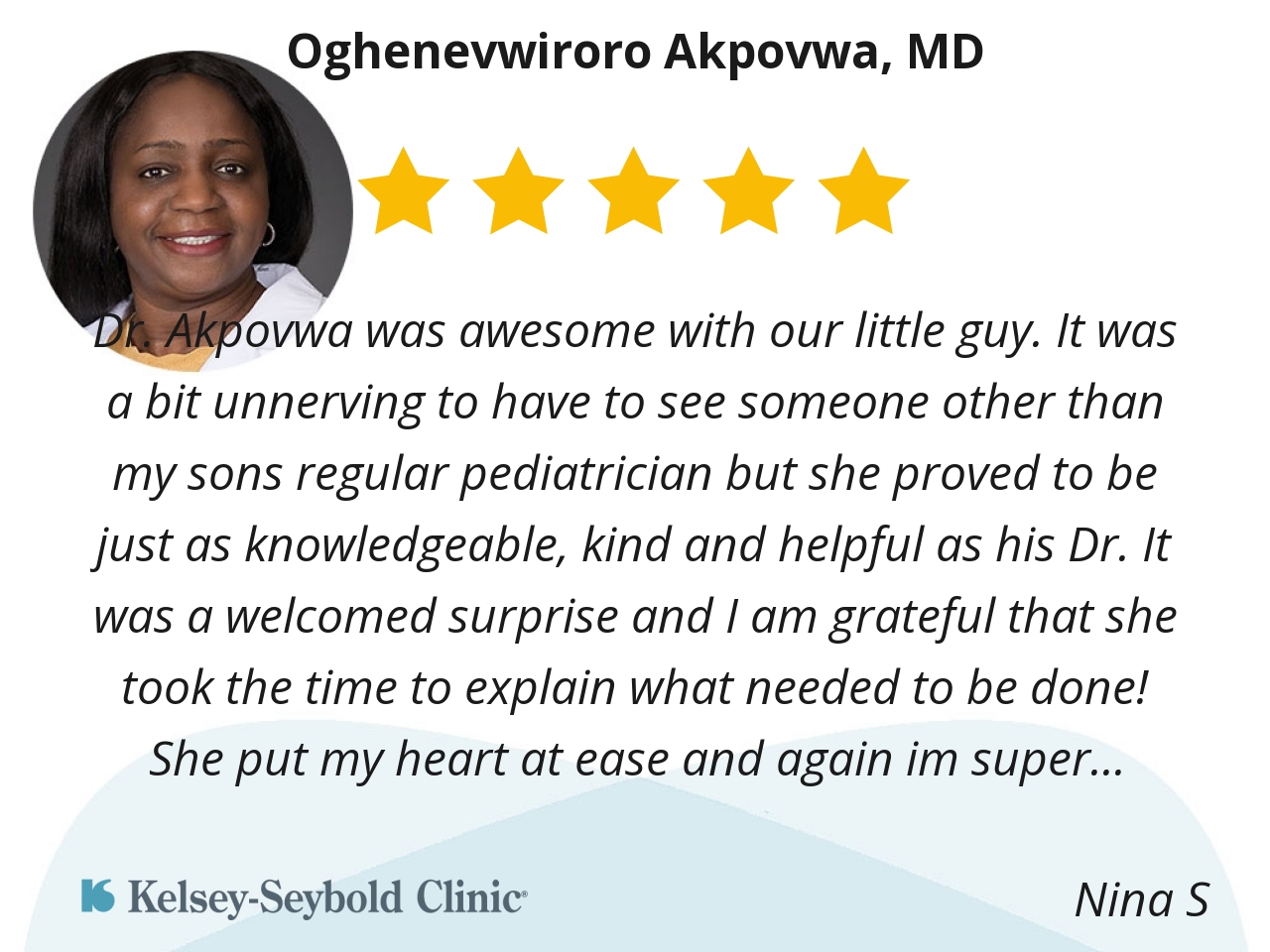 Dr. Akpovwa was awesome with our little guy. It was a bit unnerving to have to see someone other than my sons regular pediatrician but she proved to be just as knowledgeable, kind and helpful as his Dr. It was a welcomed surprise and I am grateful that she took the time to explain what needed to be done! She put my heart at ease and again im super grateful!